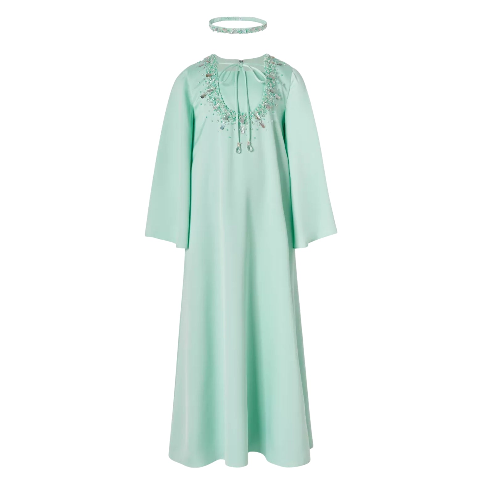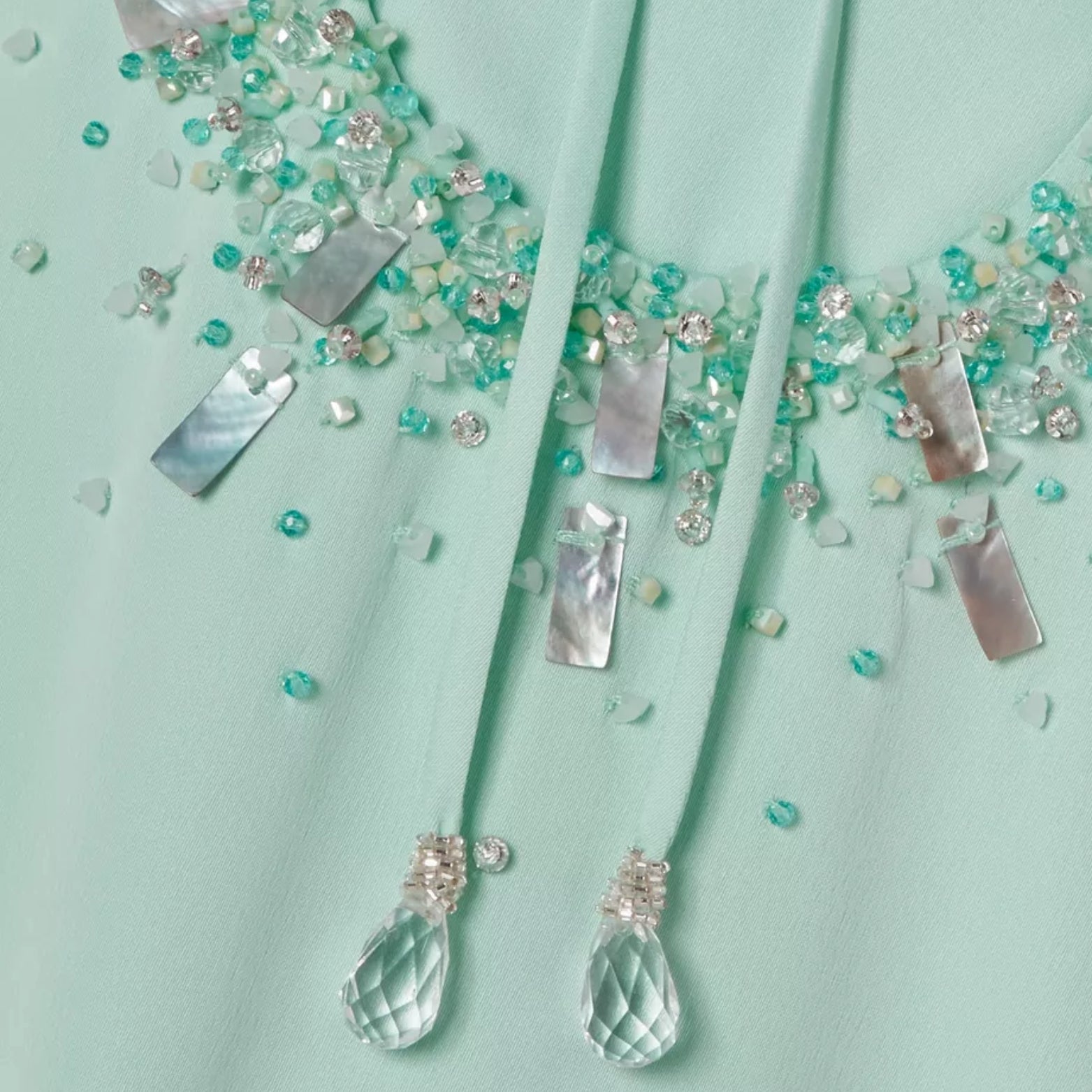 - It has a relaxed A-line cut with a concealed zip fastening and an embellished neckline