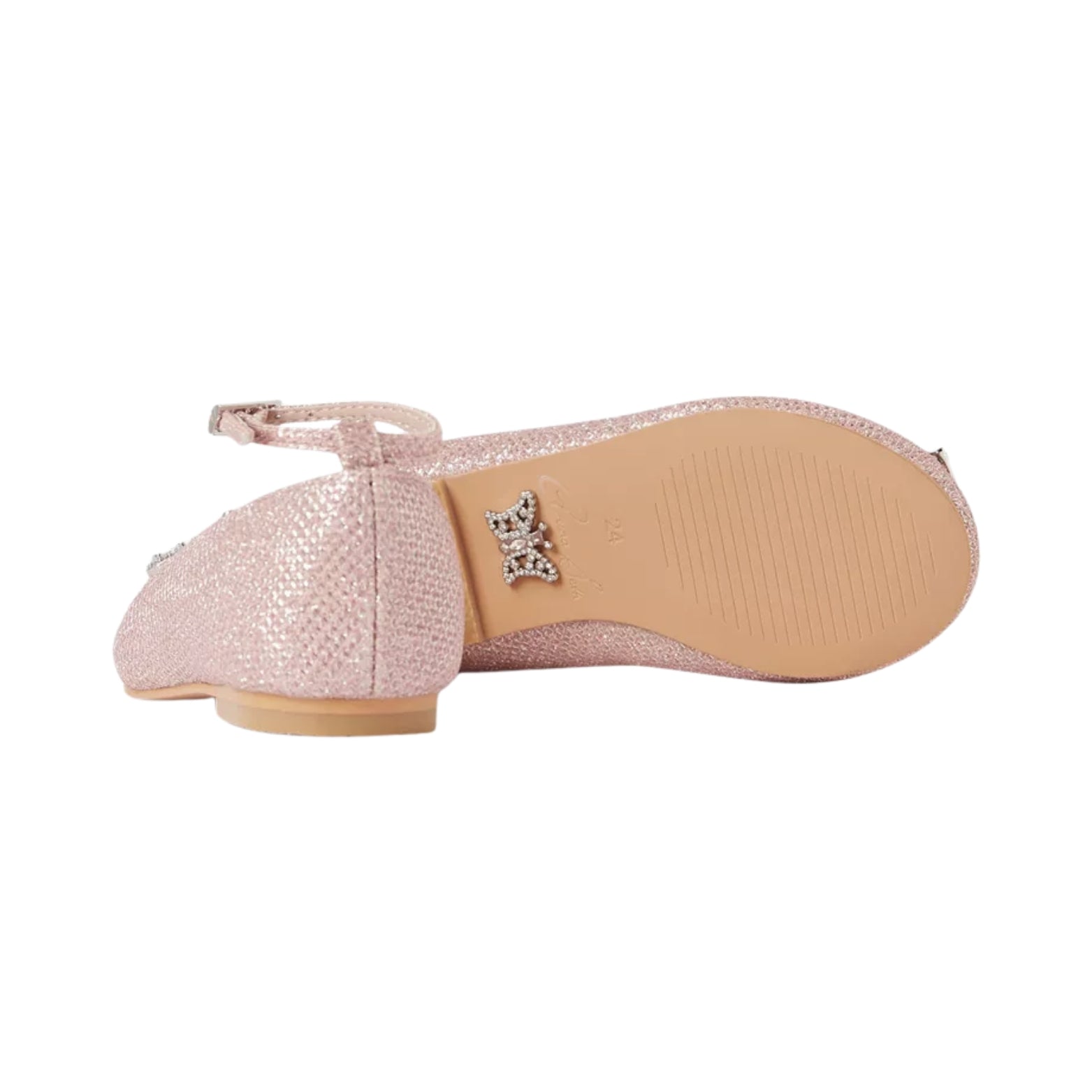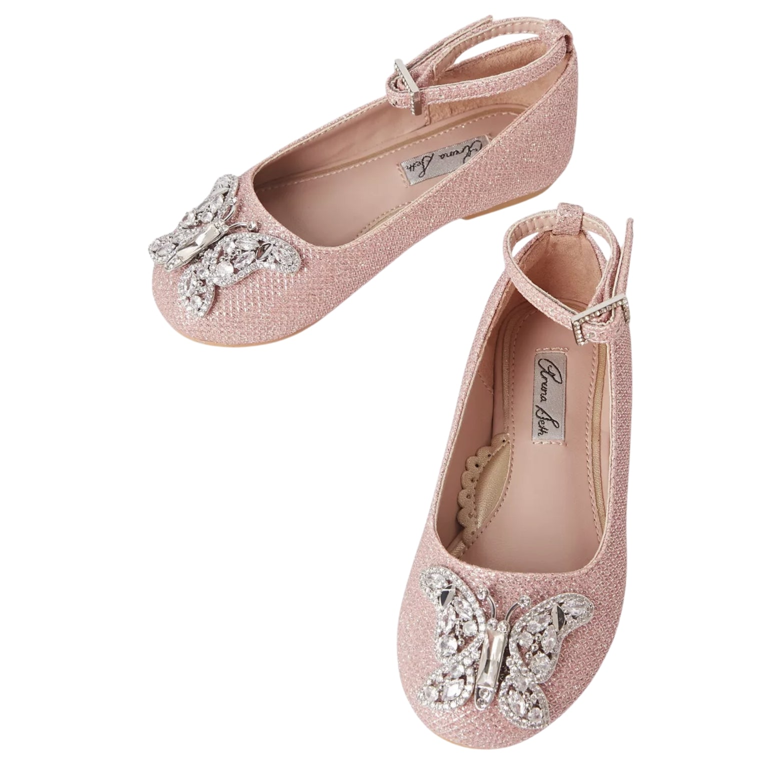• A delicate butterfly appliqué flutters atop the shiny lace upper