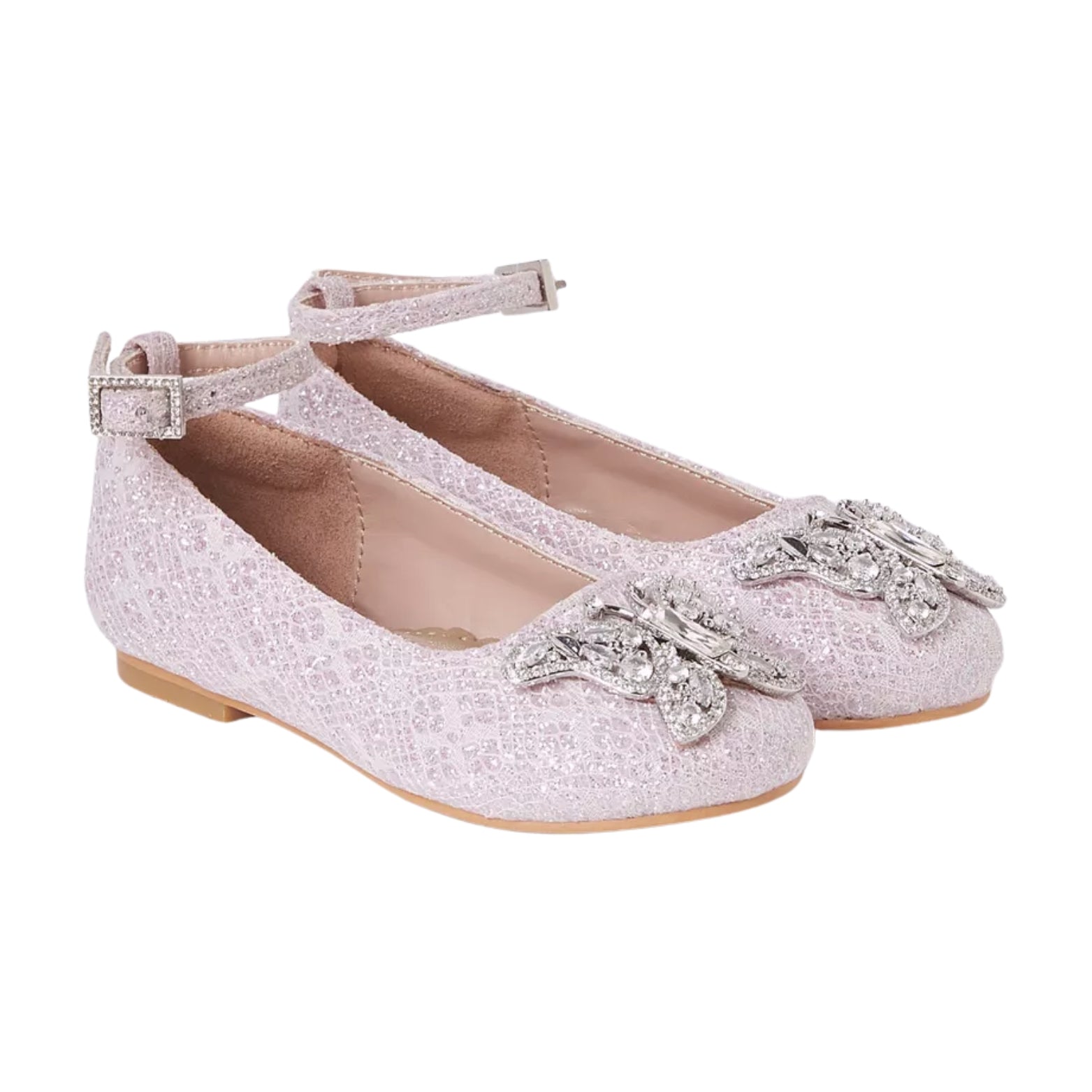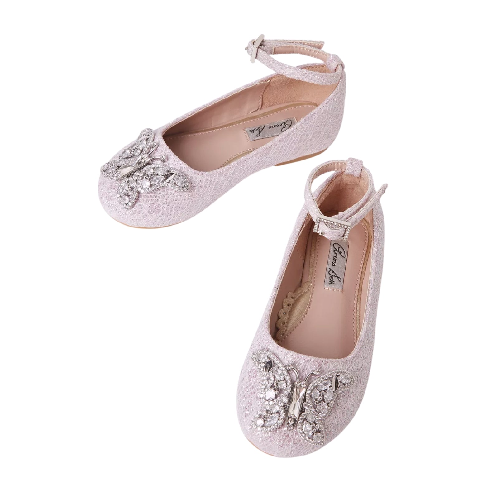 • A delicate butterfly appliqué flutters atop the shiny lace upper