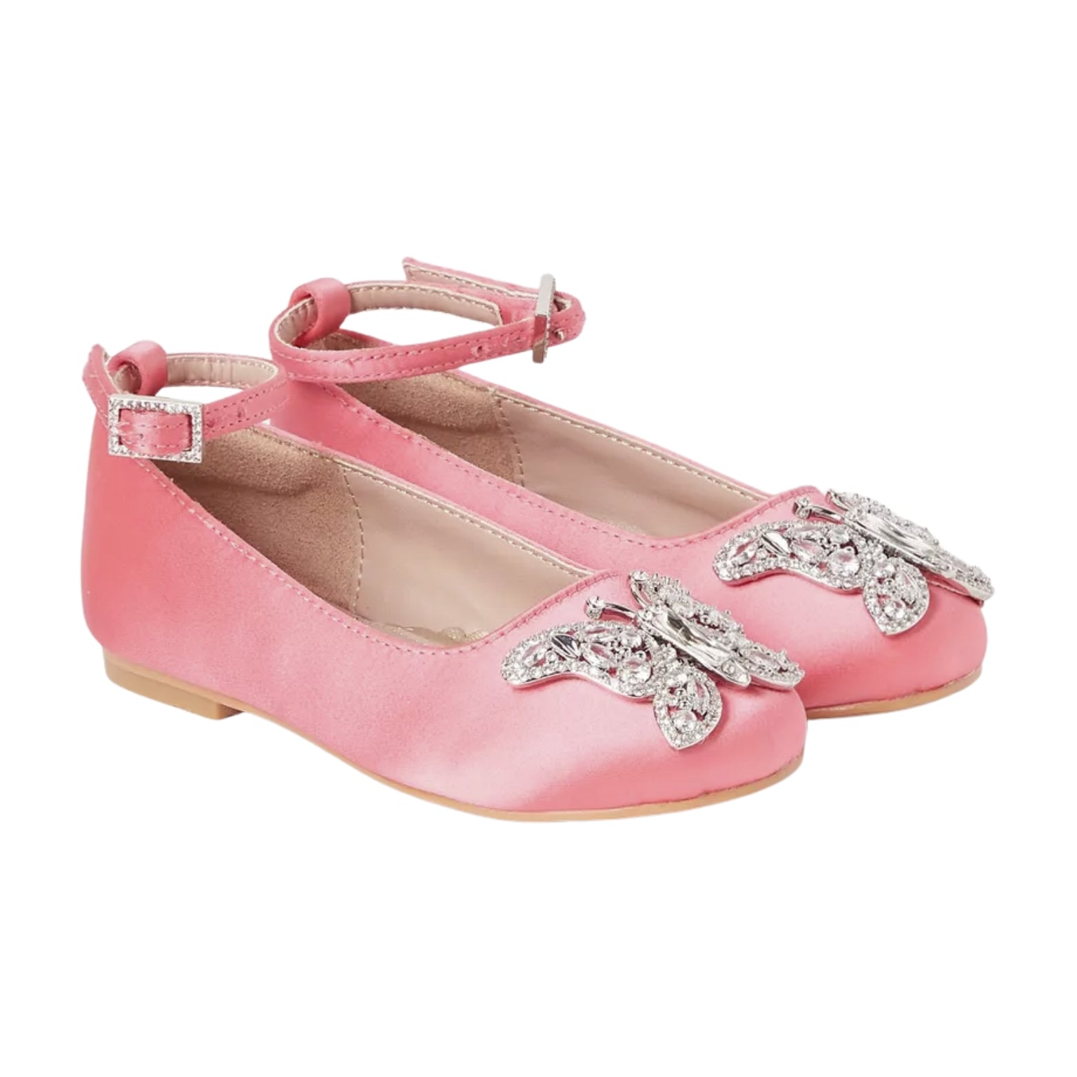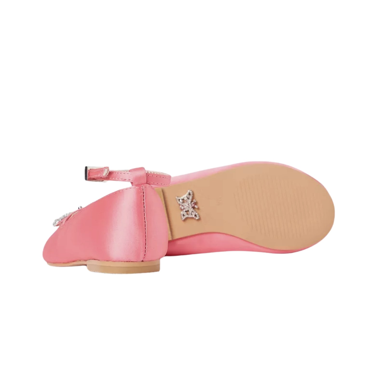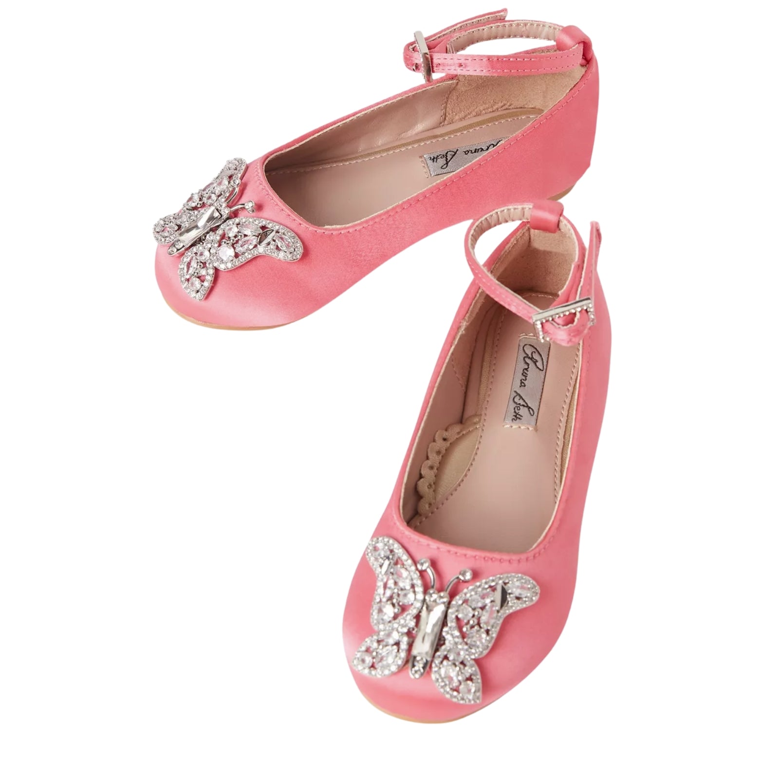 • A delicate butterfly appliqué flutters atop the shiny satin upper