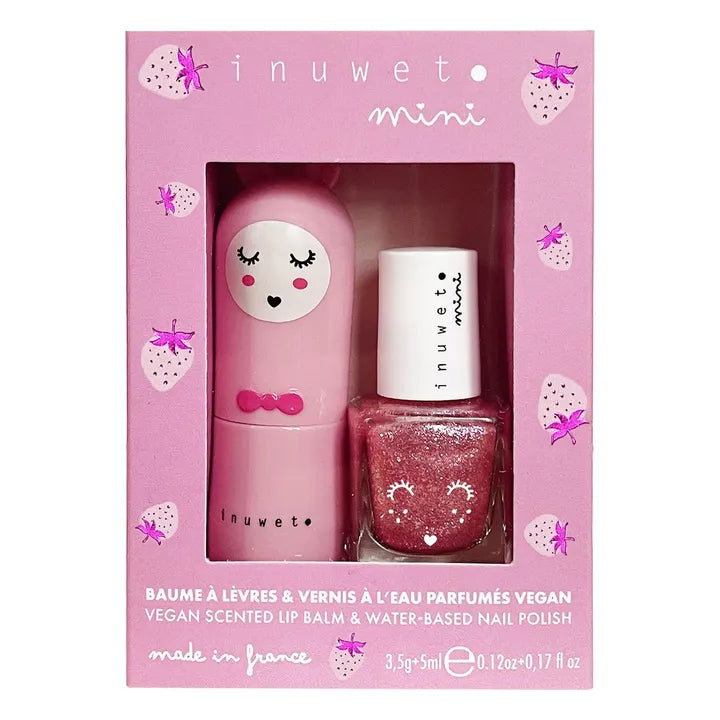- A set for minis! Nourishing, scented lip balm, enriched with shea butter and macadamia oil for intense lip hydration all day long. Scented water-based nail polish for kids, made with 82% water and without controversial ingredients to respect minis. Sweet, gourmand strawberry scent for lips, pink nail polish. Natural formulas and 100% Vegan & Made in France.