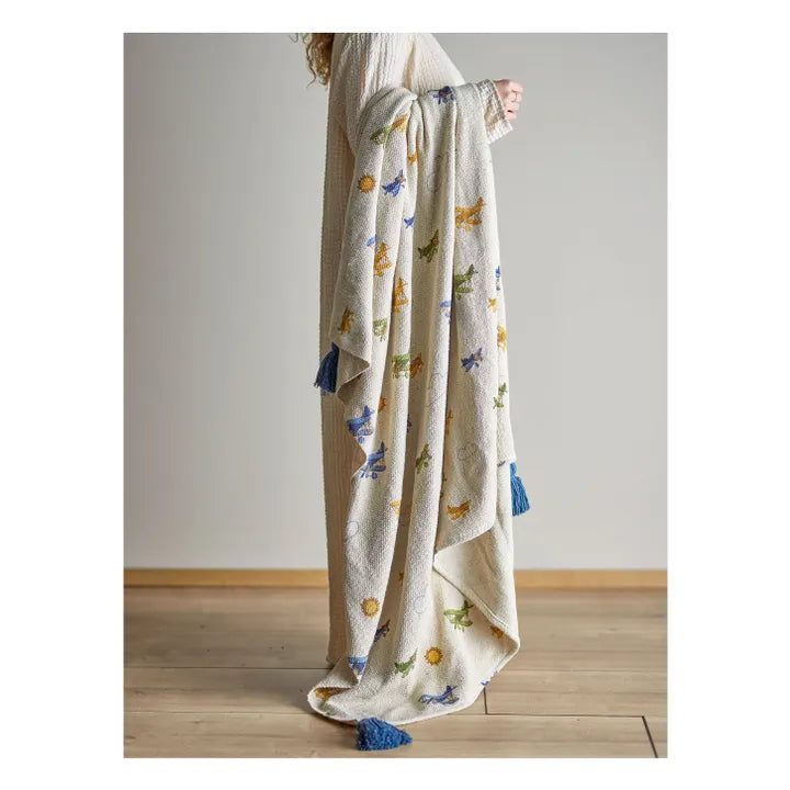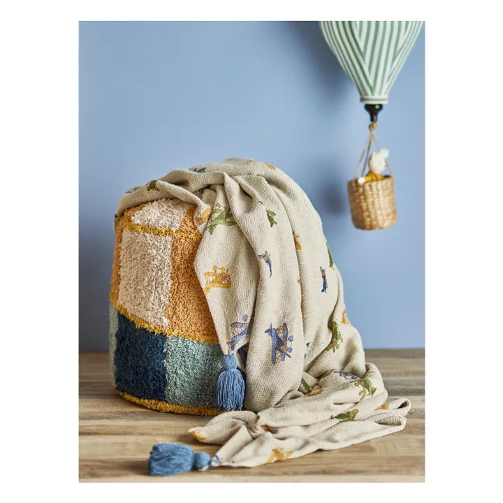 - The Plane Plaid from Bloomingville MINI is made from recycled cotton and, with its beautiful details, can bring joy and fun to any child's bedroom. The plaid is decorated with pretty airplane and cloud motifs, and blue tassels adorn each corner. Use the plaid to create a warm, cozy atmosphere, or place it on the floor when the little ones are playing.