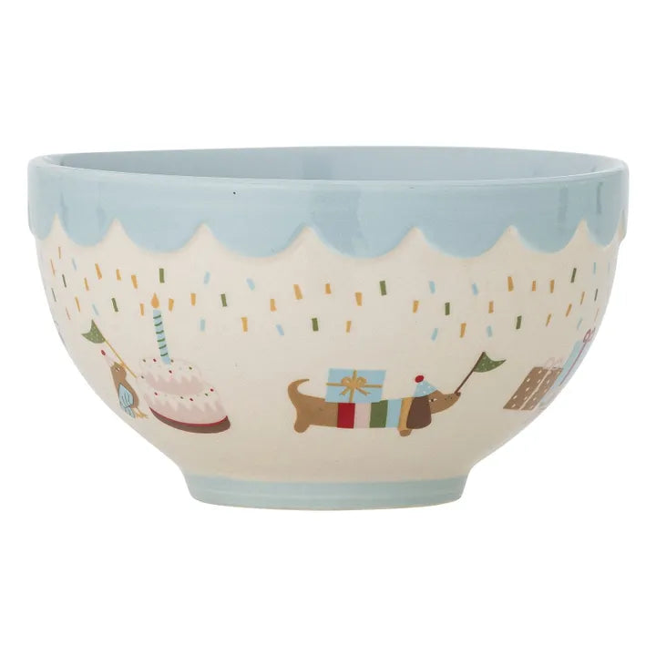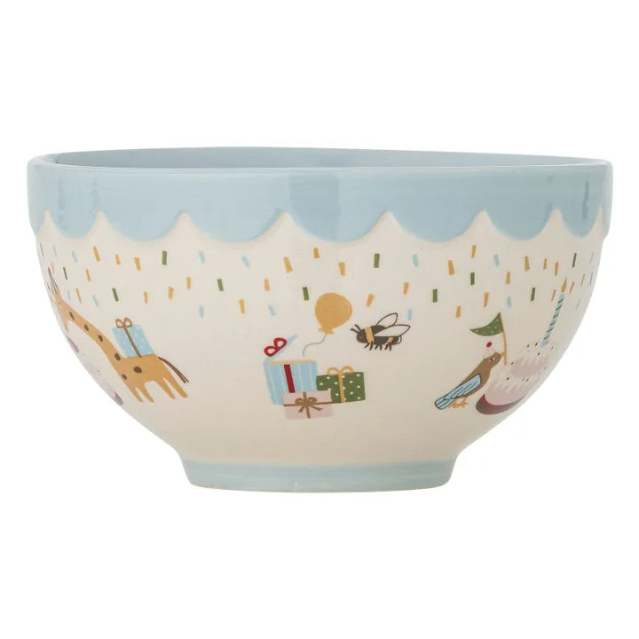 - The Celebrate Bowl from Bloomingville MINI is made of stoneware and decorated with festive characters and gifts. The blue interior creates a lovely contrast with the cheerful exterior.