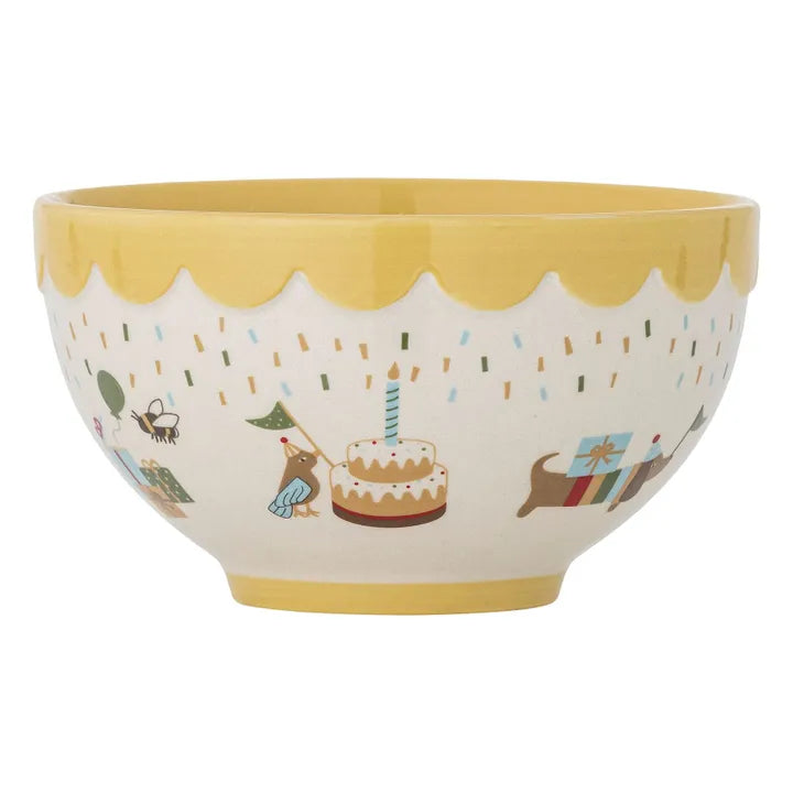 - The Celebrate Bowl from Bloomingville MINI is made of stoneware and decorated with festive characters and gifts. The yellow interior creates a lovely contrast with the cheerful exterior.