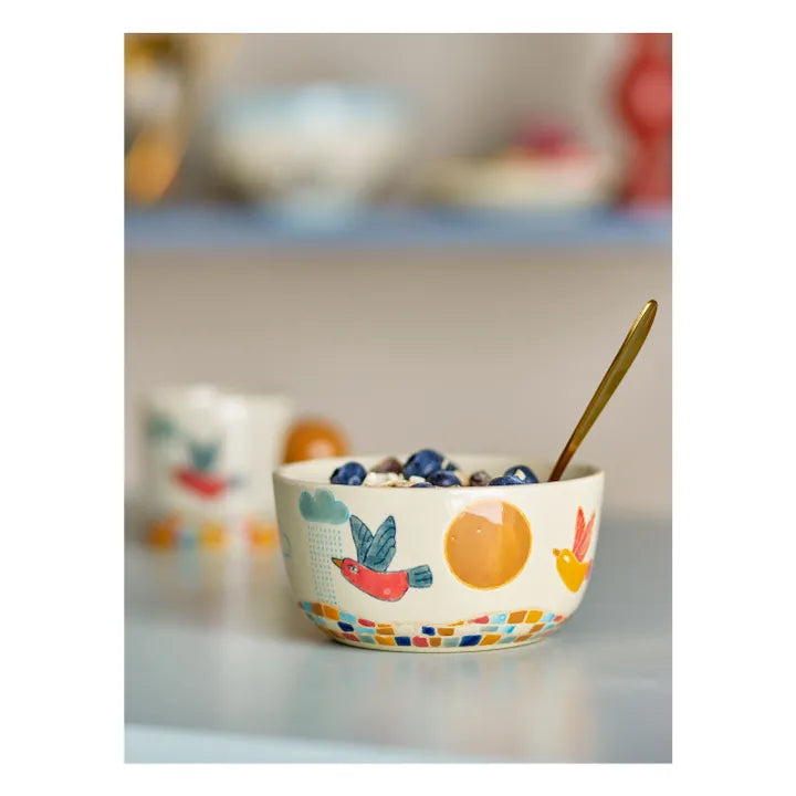 - The Colorine Bowl by Bloomingville MINI is made of stoneware and features a soothing motif of a bird flying over a peaceful landscape. Each bowl is unique due to the natural variations of the glaze.