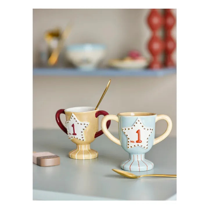 - Bloomingville MINI Trophy Cups are sold in sets of two in ceramic, each in the shape of a small trophy and in a different color. Embellished with a star and the inscription "No. 1", they add a playful touch to everyday drinks and festive moments.