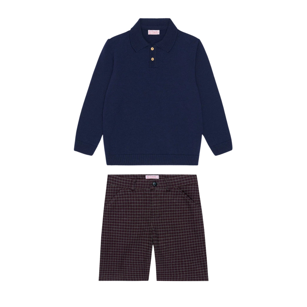 Navy Merino Polo Jumper & Burgundy Check Shorts