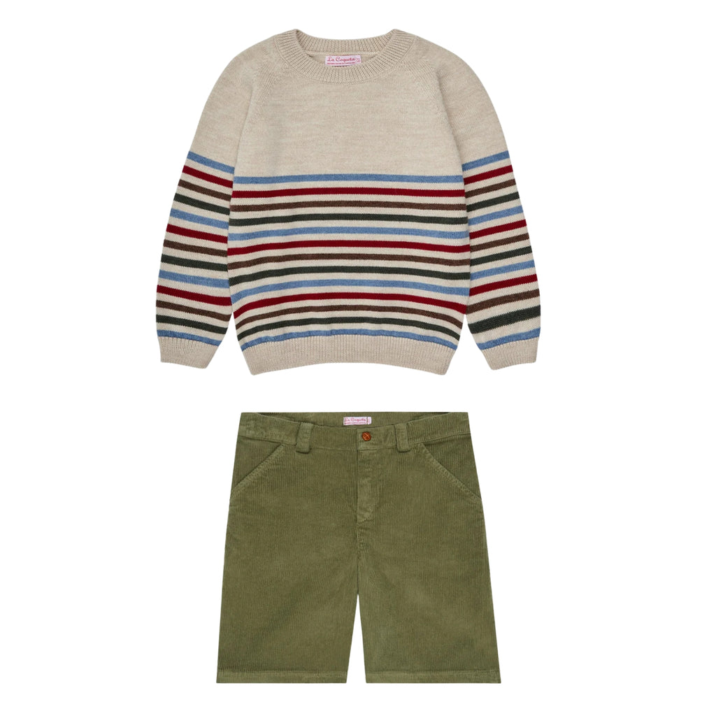 Oatmeal Stripe Curro Merino-wool Jumper & Green Corduroy Shorts