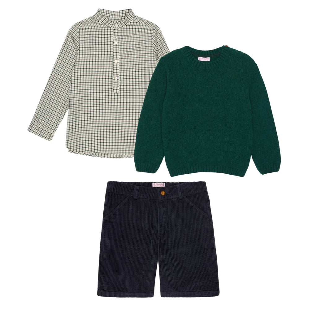Set of 3 | Green Check Cotton L/sleeves Shirt & Forest Merino Jumper & Navy Corduroy Shorts