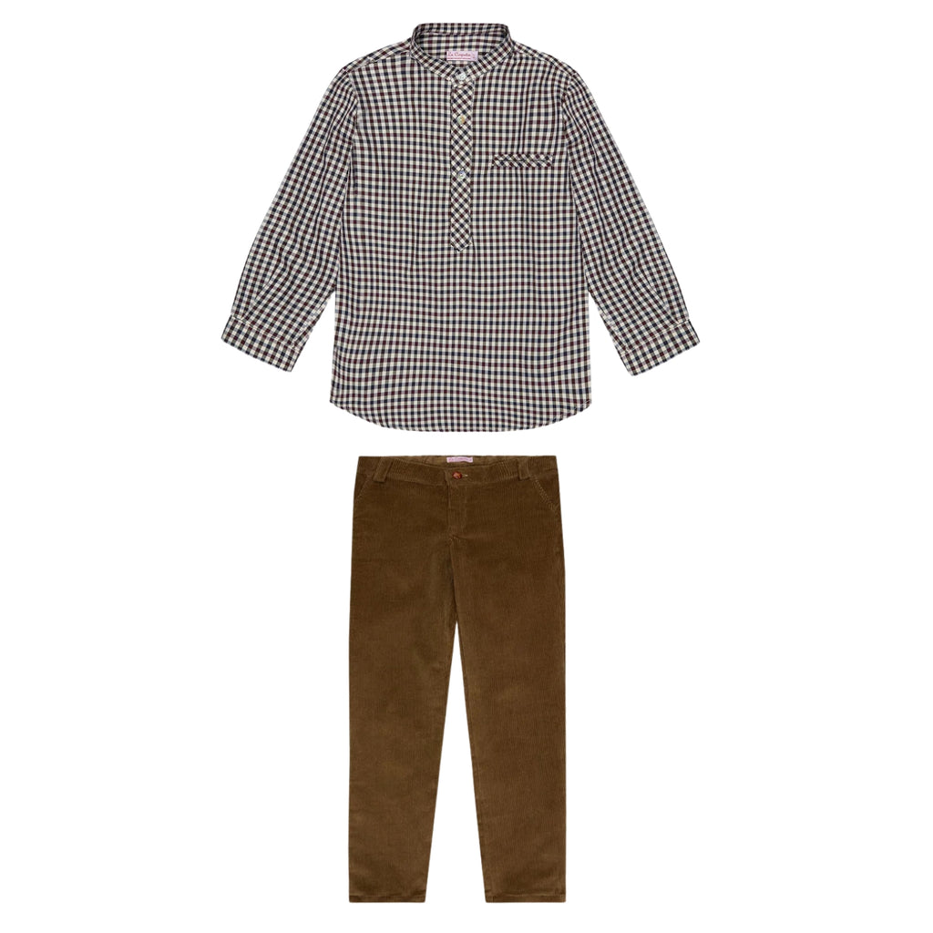 Burgundy Check Long Sleeve Kurta Shirt & Biscuit Corduroy Trousers