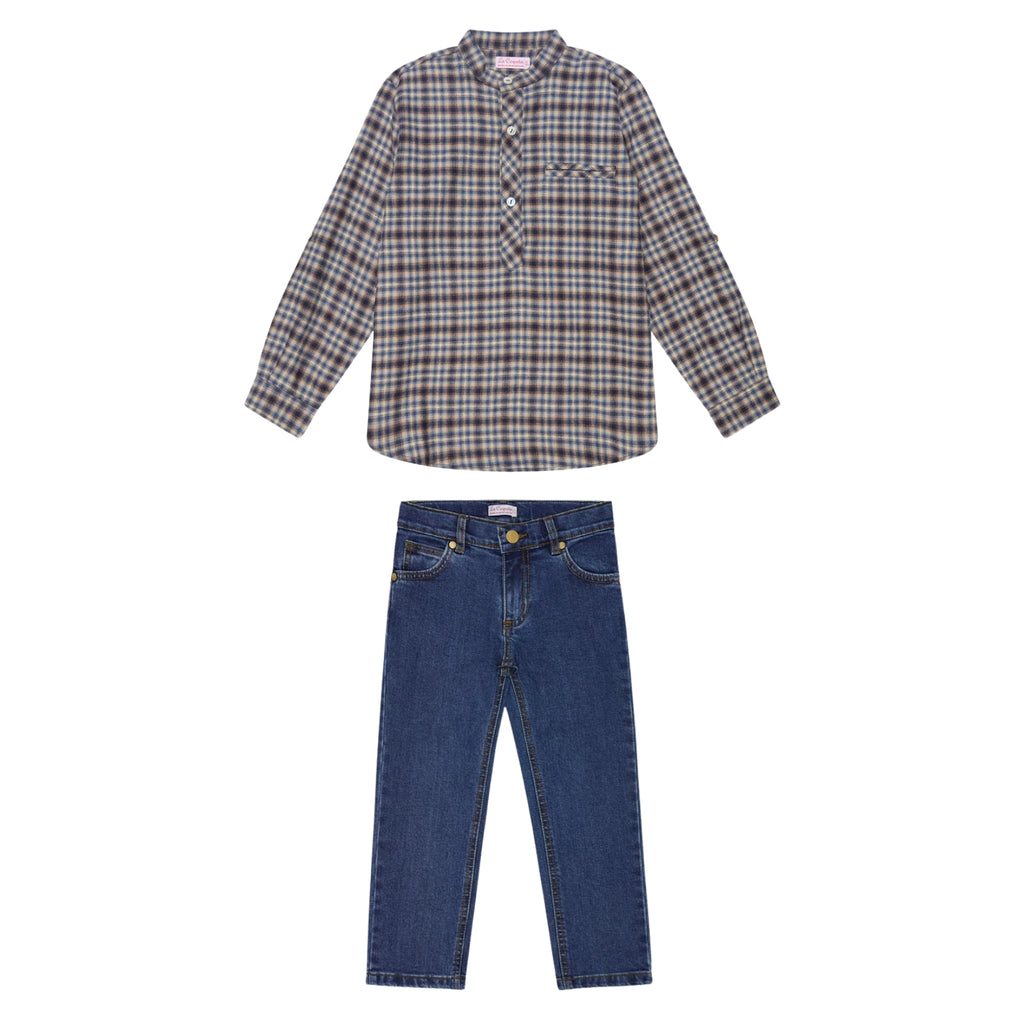 Navy Check Long Sleeve Kurta Shirt & Blue Jeans