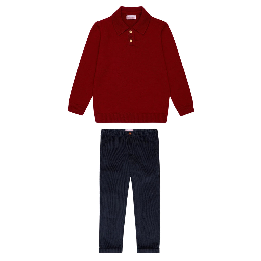 Burgundy Merino-wool Polo Jumper & Blue Corduroy Trousers
