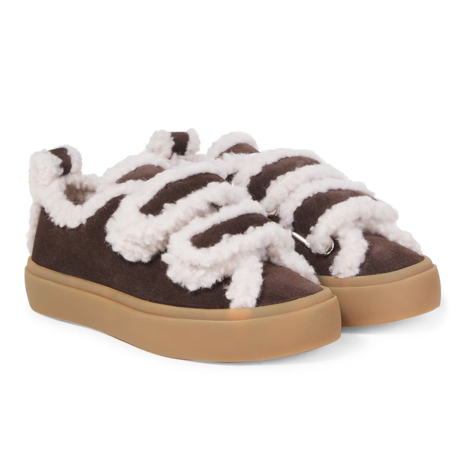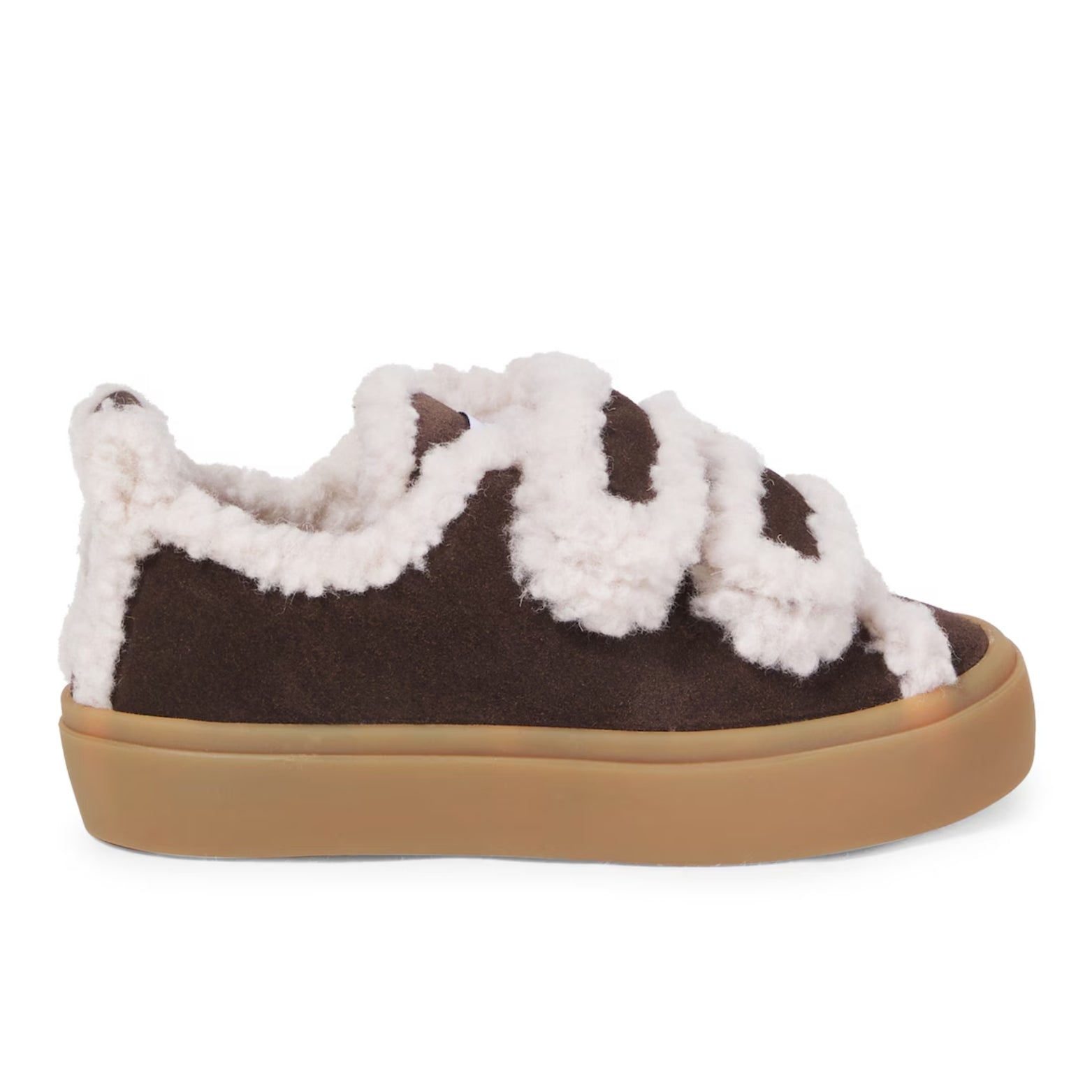 These cozy sneakers by Inuikii Kids are constructed from soft brown suede with shearling trims. The low-top pair is easily secured with VELCRO® fastenings on the uppers.