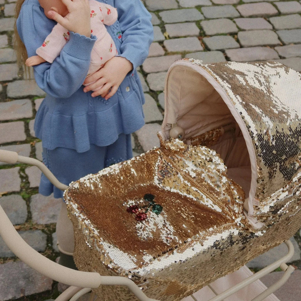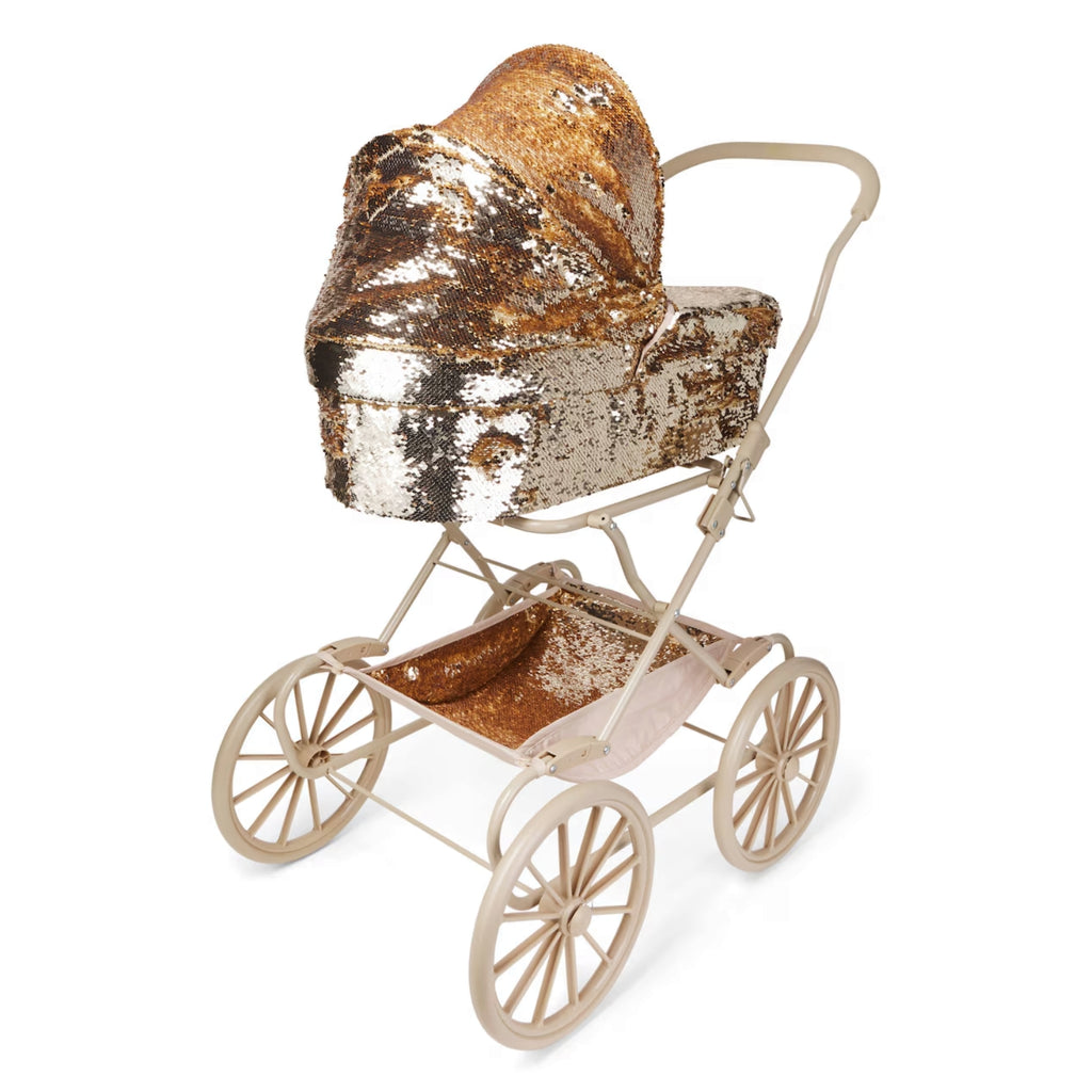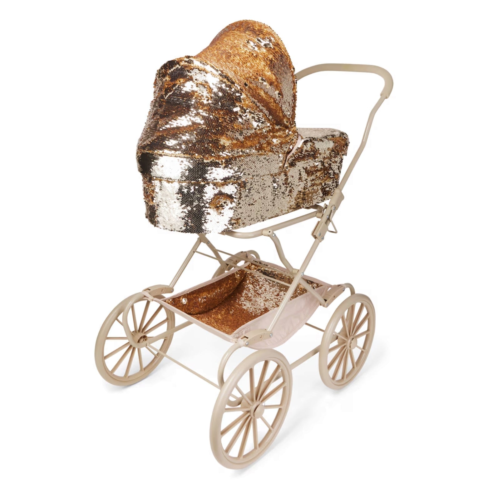 This doll stroller from Konges Sløjd is a charming companion for playtime. Fully assembled and easy to fold, the design comes with a soft mattress, four large wheels, and sparkly sequins throughout.