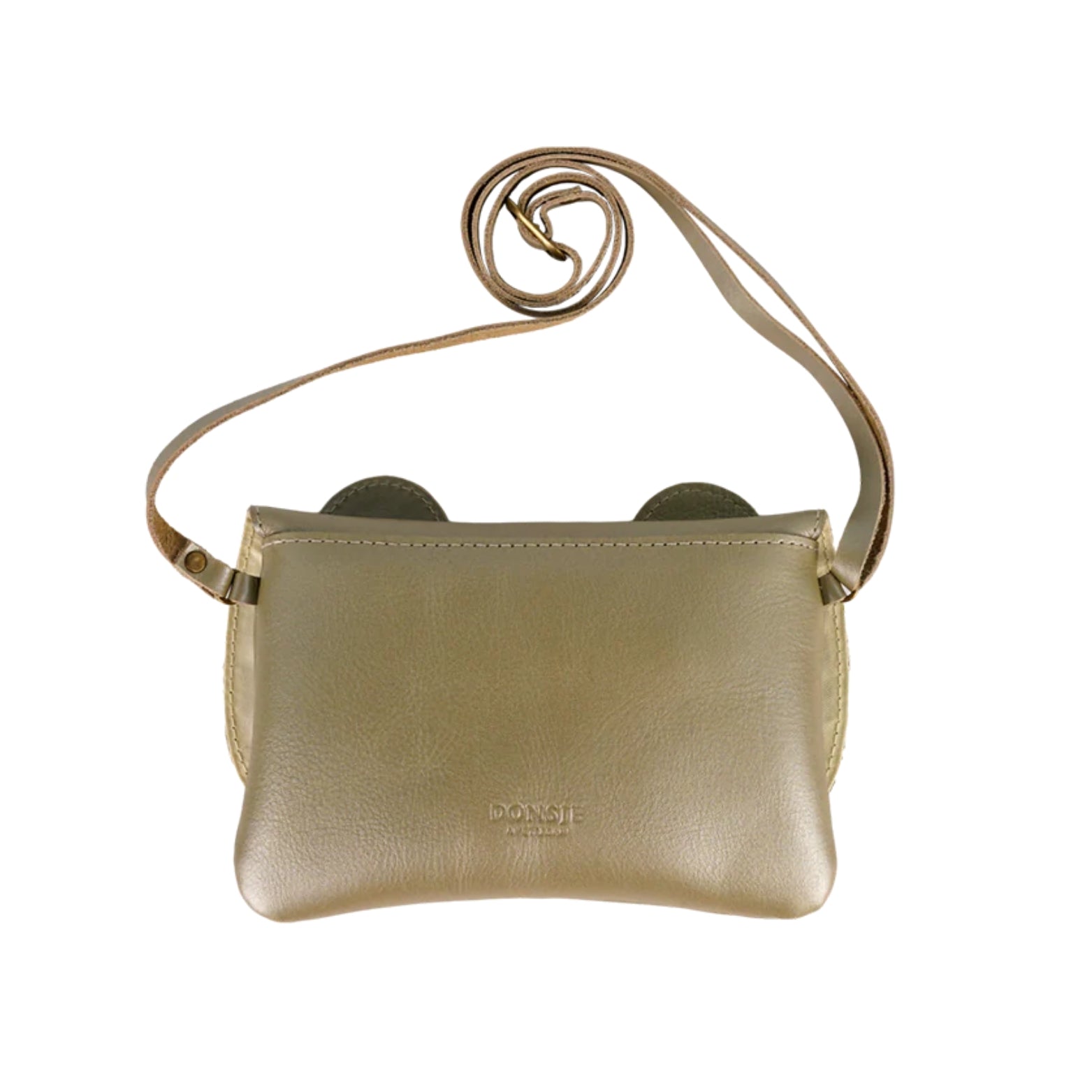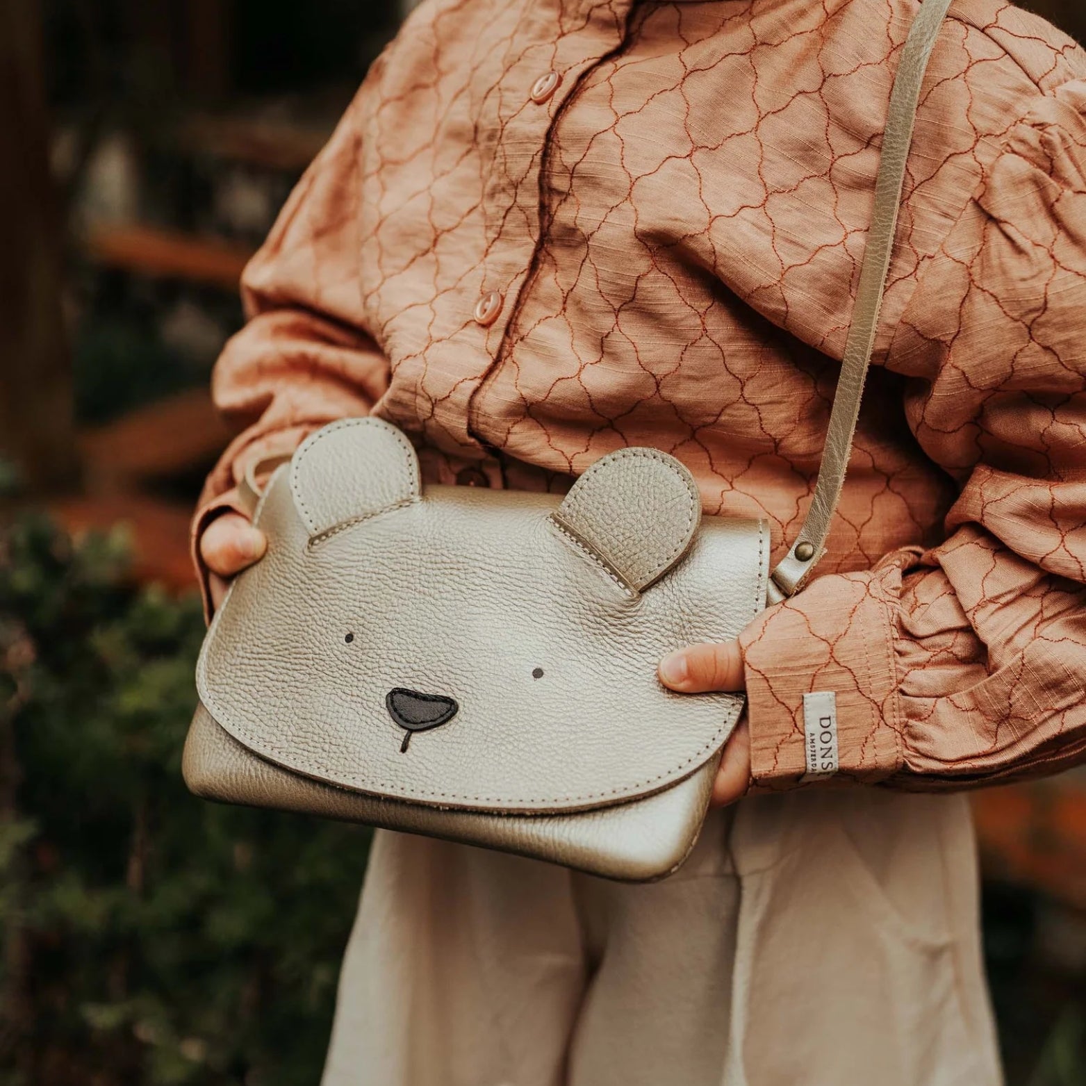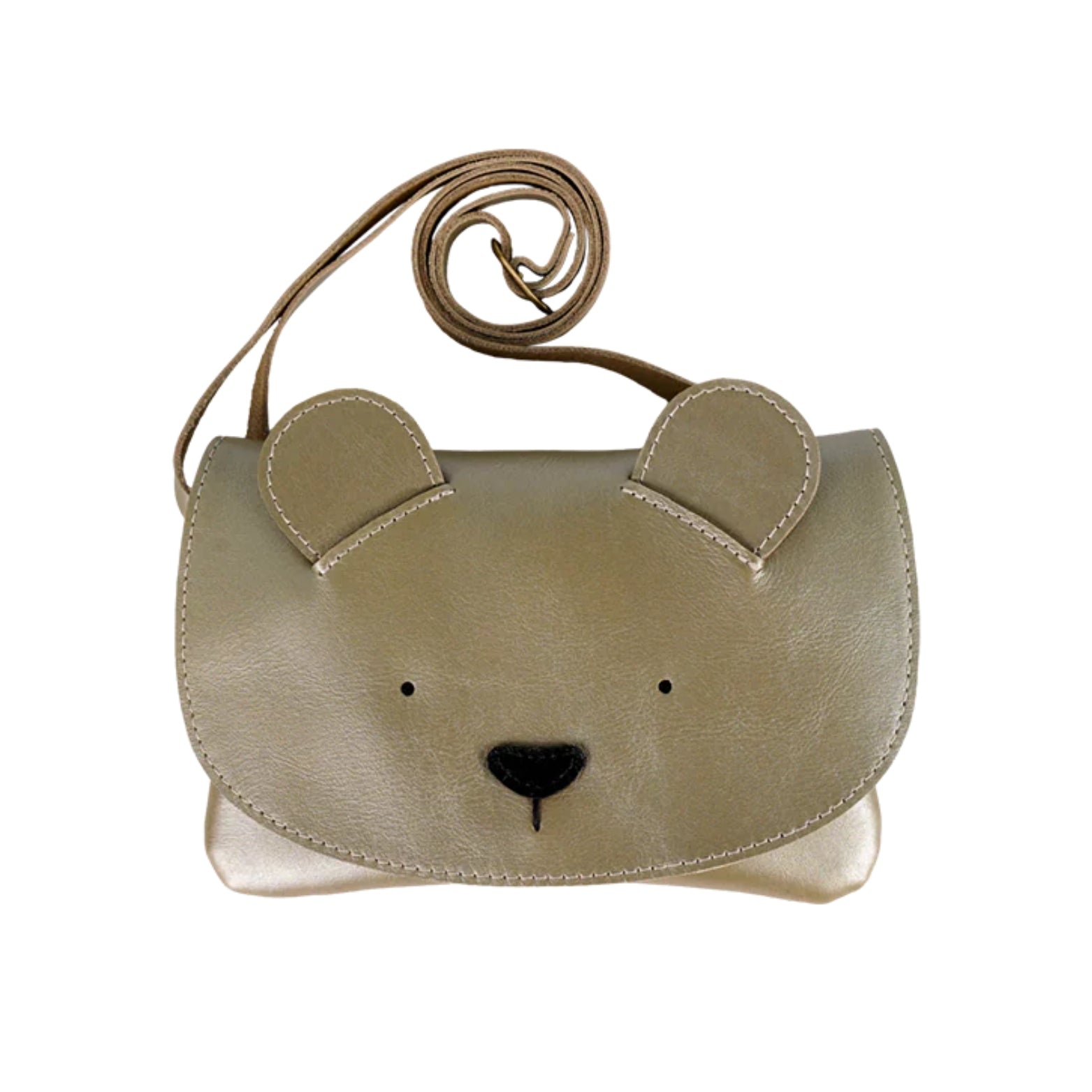 The Alaula Bear Purse features metallic leather and an adjustable strap. It's the perfect companion for your little girl this summer. A sturdy and sweet bag for all her treasures.