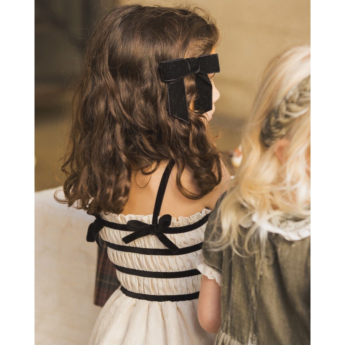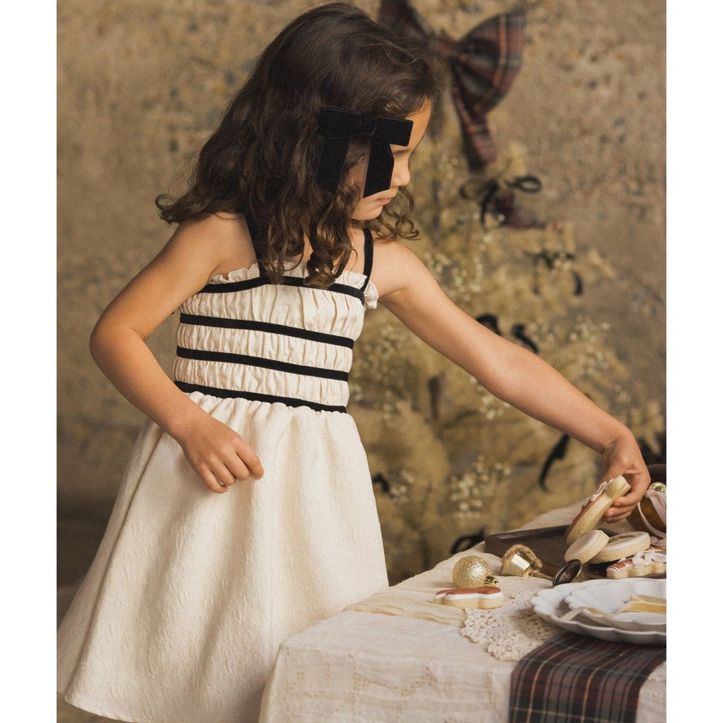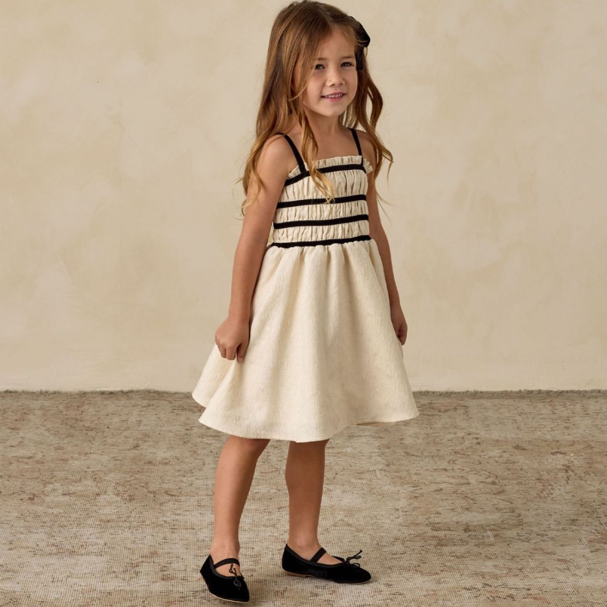 The Annabelle Dress features a smocked bodice with velvet trim, delicate straps with bows at the back and a full skirt in a beautifully textured jacquard. In shimmering metallic ivory, this dress is both classic and festive, layering perfectly with our Bow Cardigan in ruby for an extra-special look. Color: Metallic Ivory Care: Hand wash cold, lay flat to dry. Do not iron. Shell: 77% Viscose 23% Polyamide; Lining: 100% viscose; Exclusive of decoration