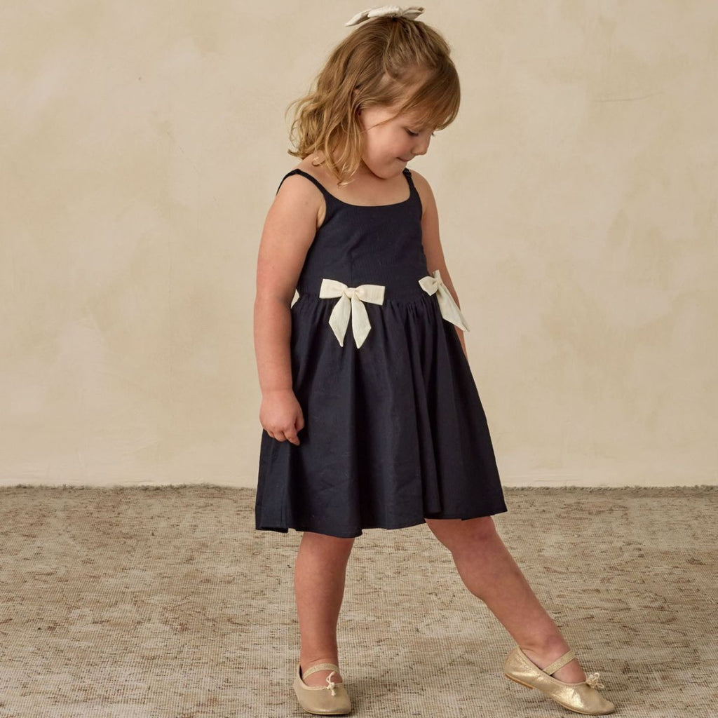 Our Betsy Dress features fixed front bows, spaghetti straps, smocking at the back, and a front V waistline. Featuring our overall 'black' hue with white bows for a cute contrasting pop! Care: Machine wash cold. Hang dry. Shell:100% cotton, Lining:100% viscose