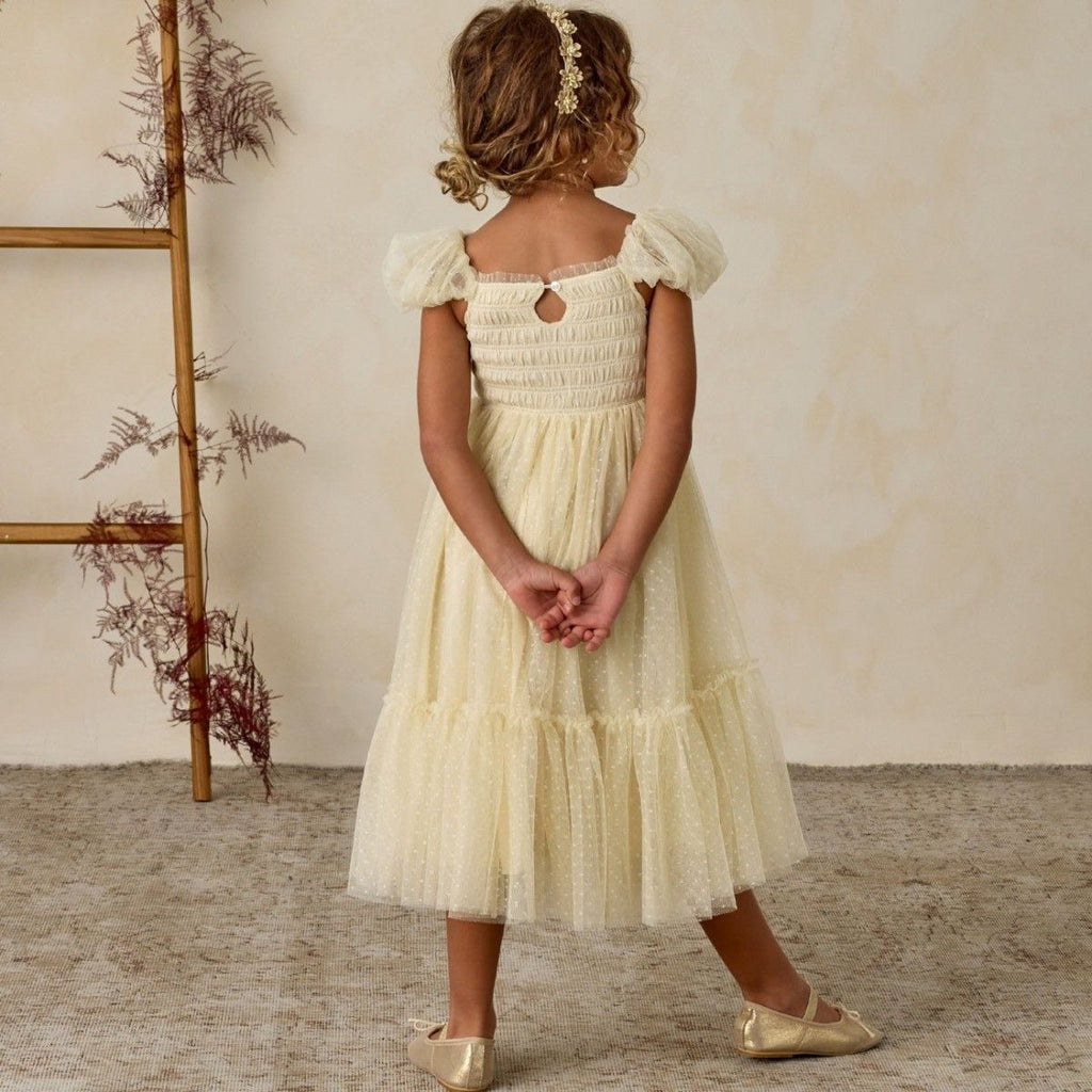 Our Clara Dress, crafted from shimmering tulle, features a smocked bodice adorned with a bow appliqué, gathered bubble cap sleeves, and a full, tiered skirt.
