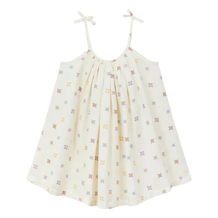 - Strapless dress with exclusive floral print. - Fabric printed with a blend of viscose and linen. - Thin straps with small fixed bows at shoulders. - Gathers at front and back.