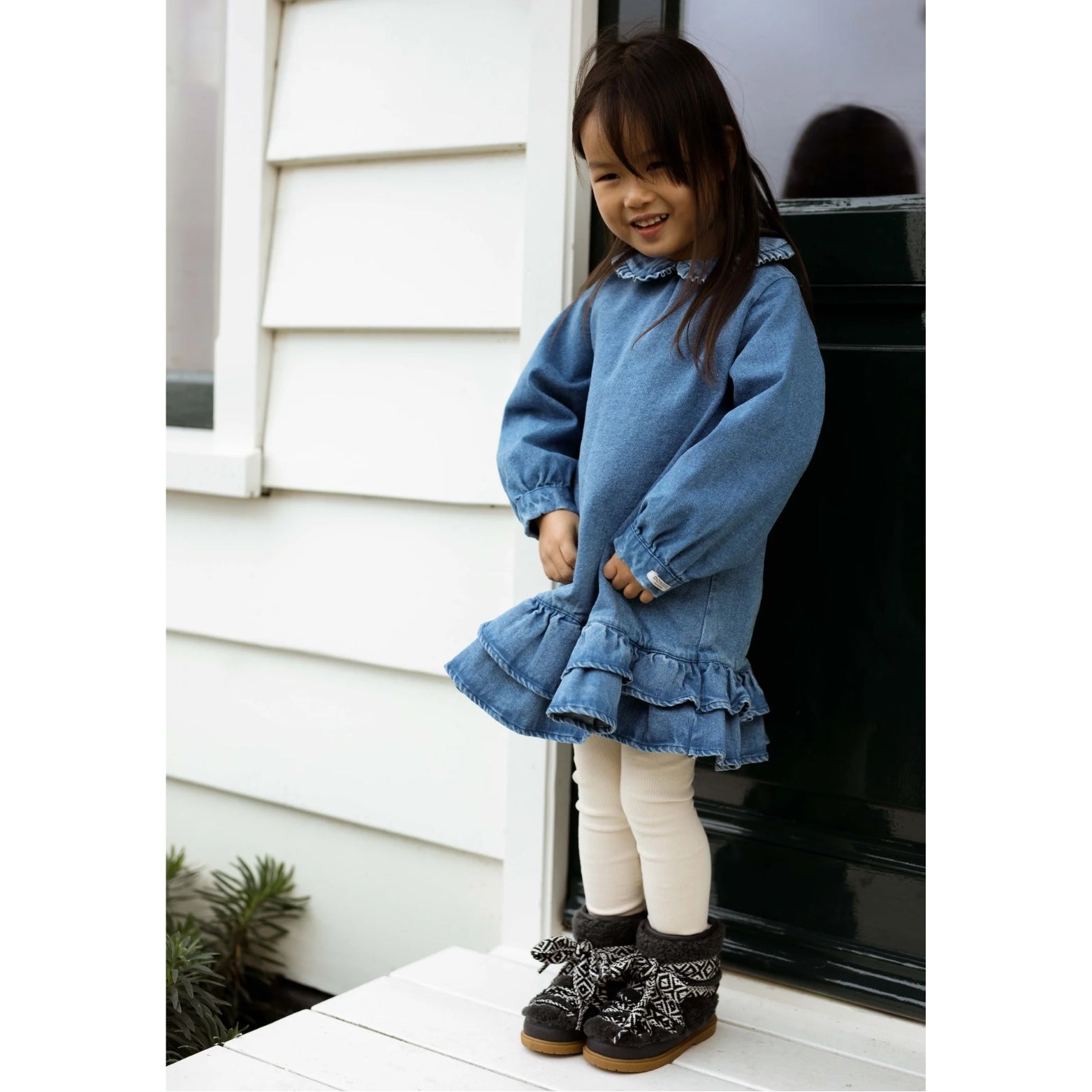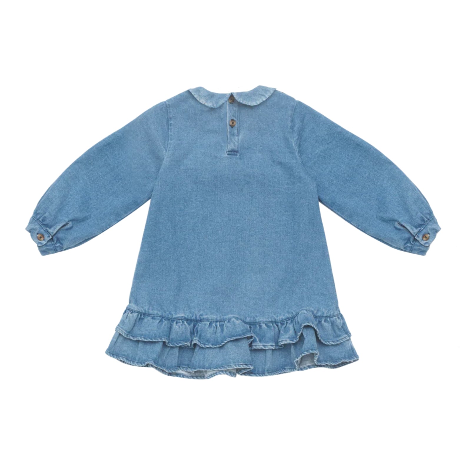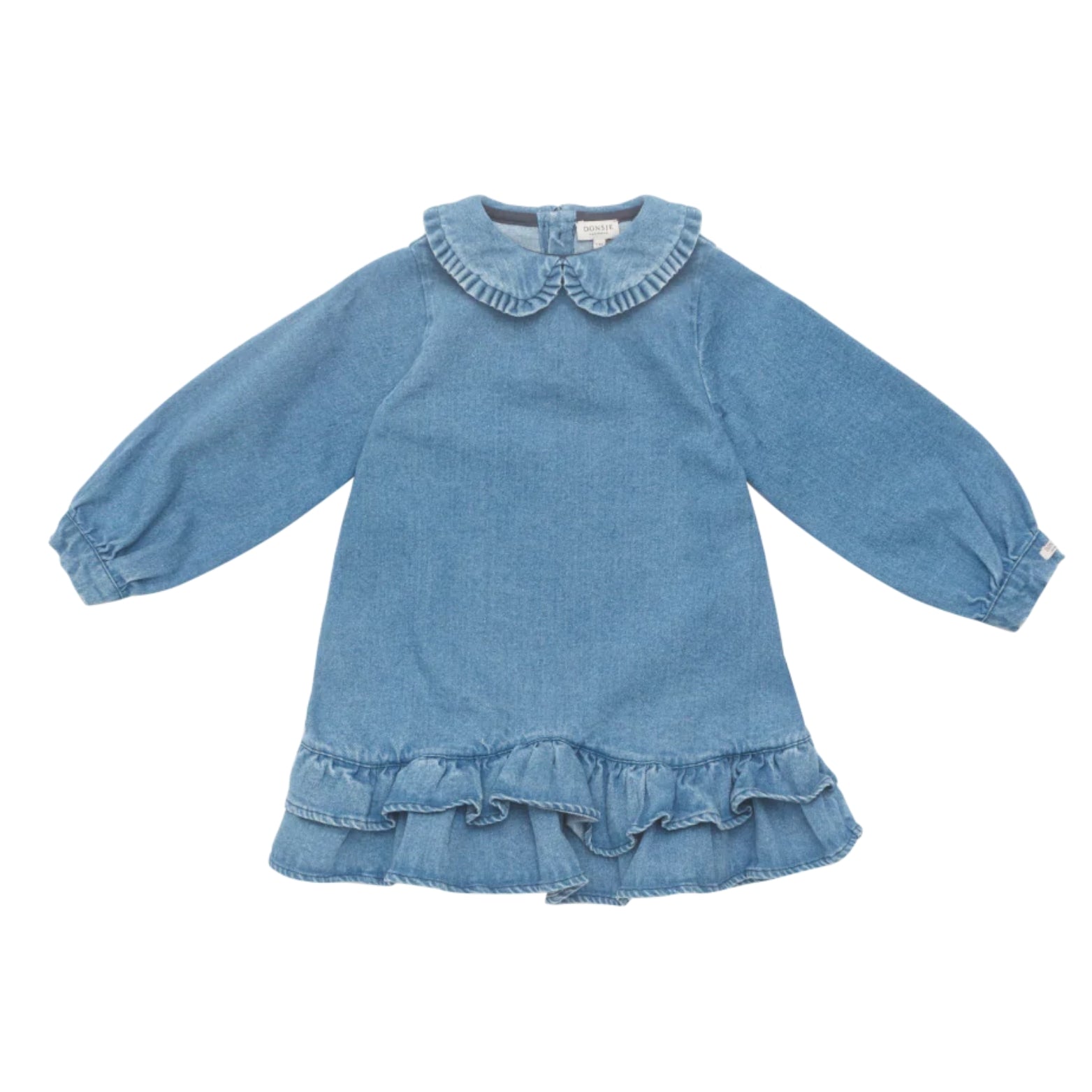 The dress by Donsje is crafted from denim and features a comfortable silhouette. Delicate ruffles decorate the hem, while the Peter Pan collar and puff sleeves add an elegant touch to the ensemble.