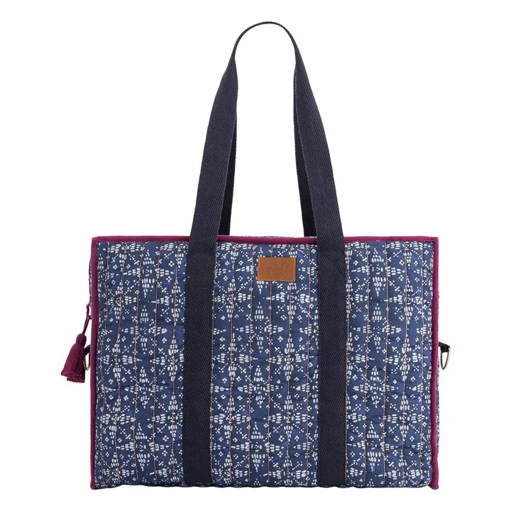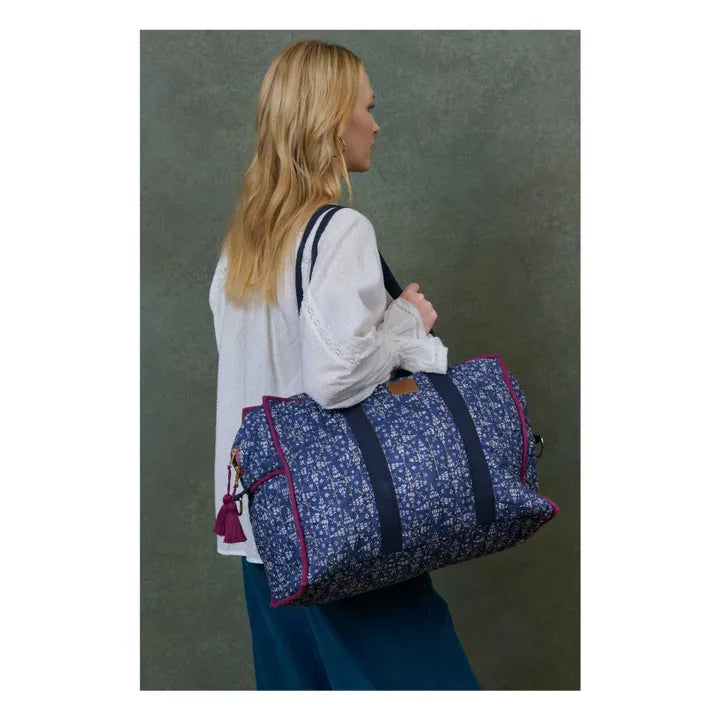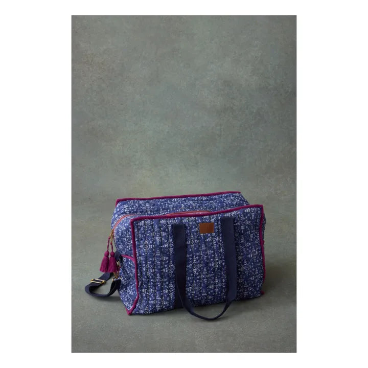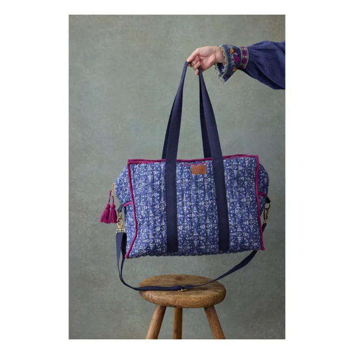 - Quilted cotton voile travel bag. Rectangular shape. All-over floral print and gold stitching. 5 interior pockets. Large plain handles. Large removable shoulder strap with gold snap hooks. Embossed leather patch. Gold zipper opening. Colorful handmade tassels. Contrasting piping around the edges. Striped water-repellent lining. Designed in Paris by Marie Pidancet and her team.