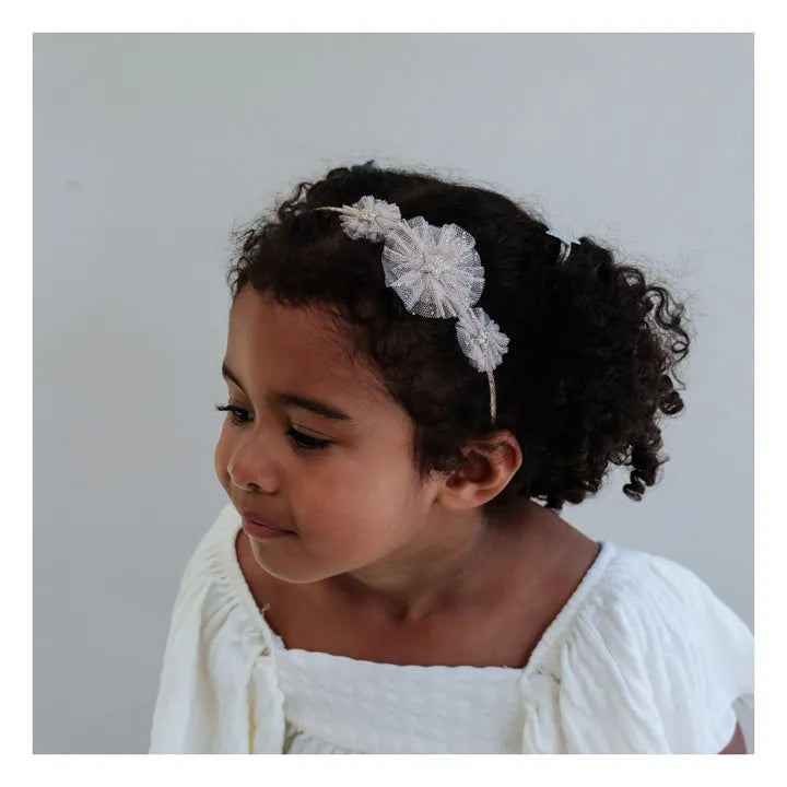 • Add a touch of ballet magic to any hairstyle with this delightful tulle rosette alice band. Adorned with delicate tulle rosettes sprinkled with glitter and topped with sparkling gold centres. Perfect for little dancers or anyone wanting a sweet, shimmering accent to brighten everyday looks.