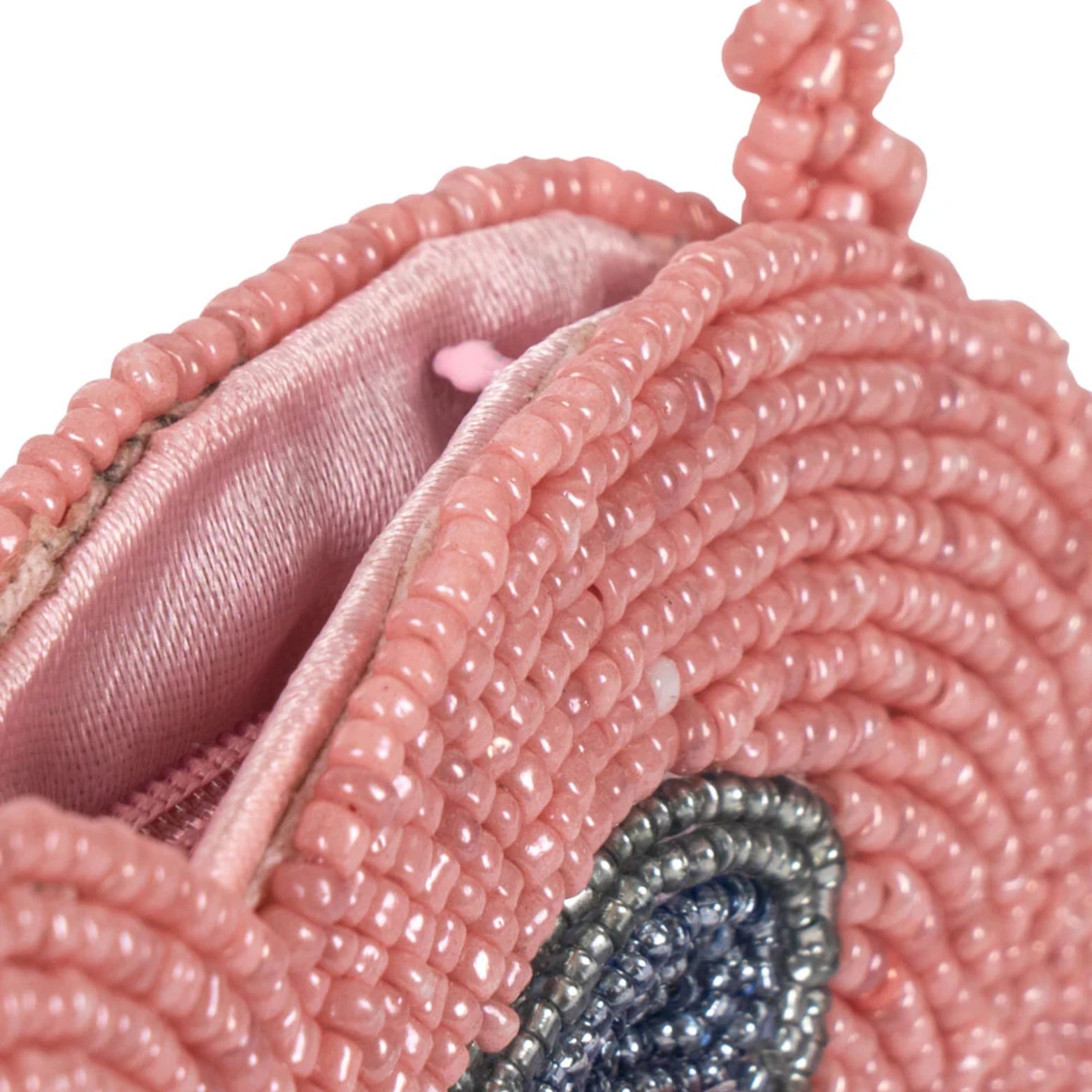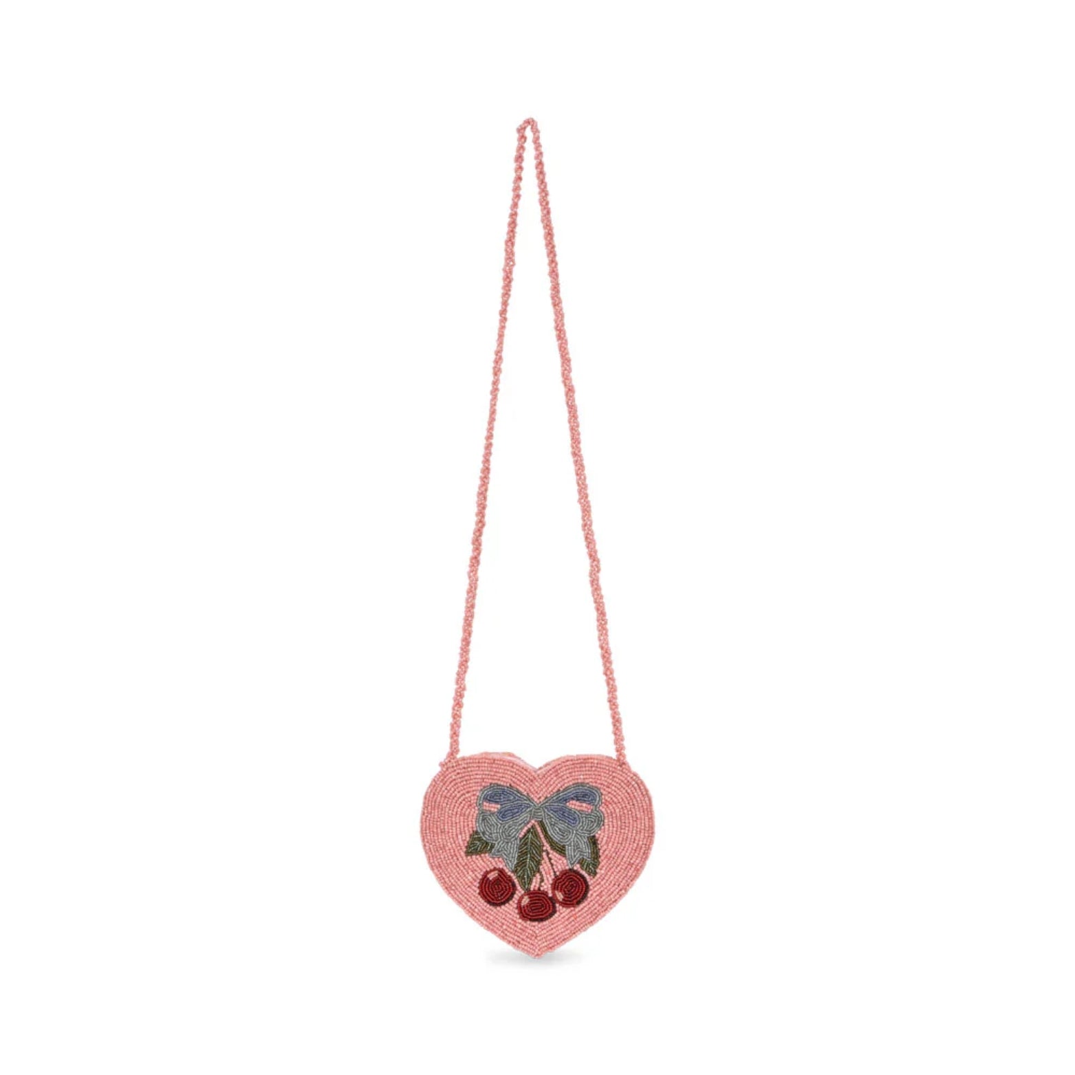 Sweet little heart-shaped shoulder bag adorned with beads that are attached by hand.