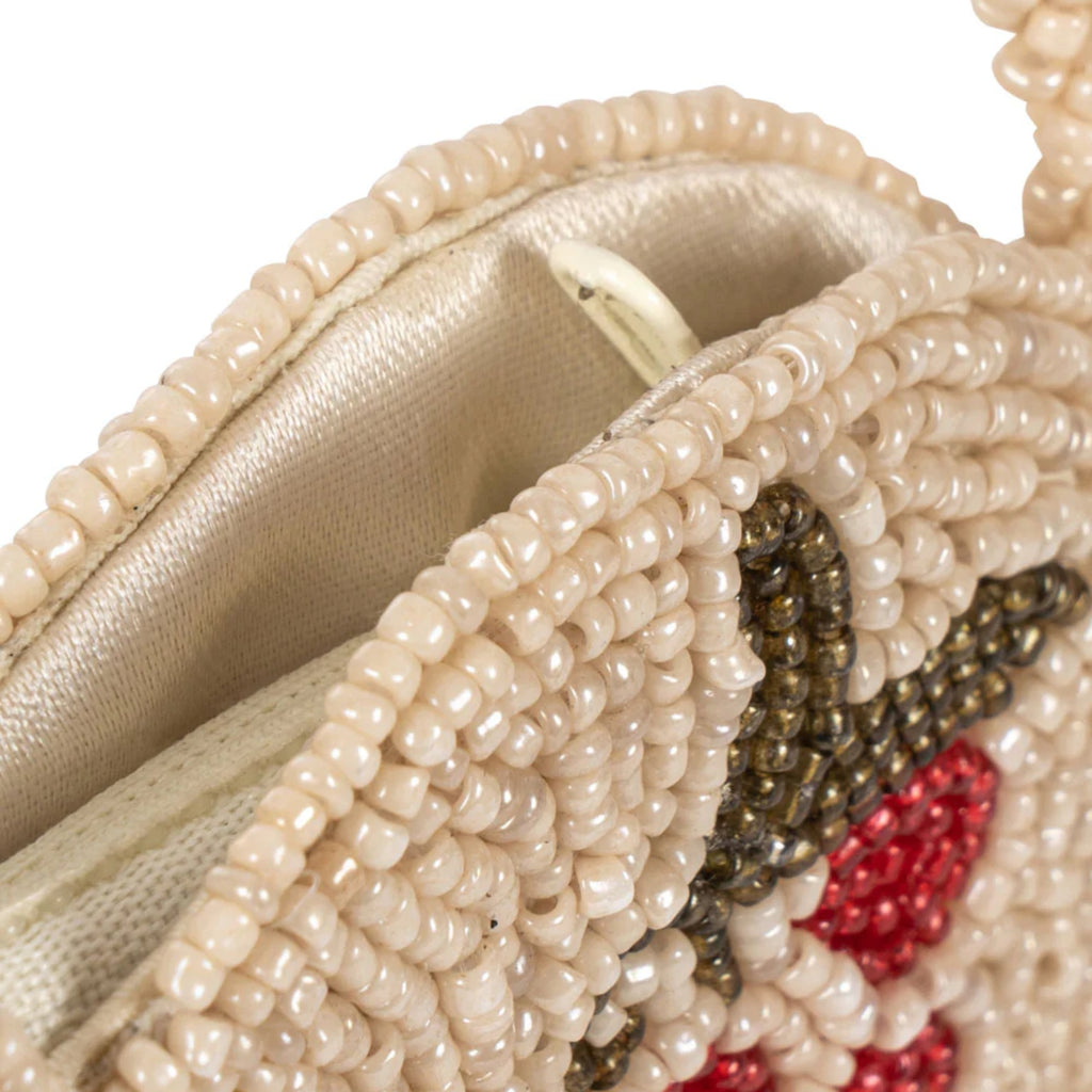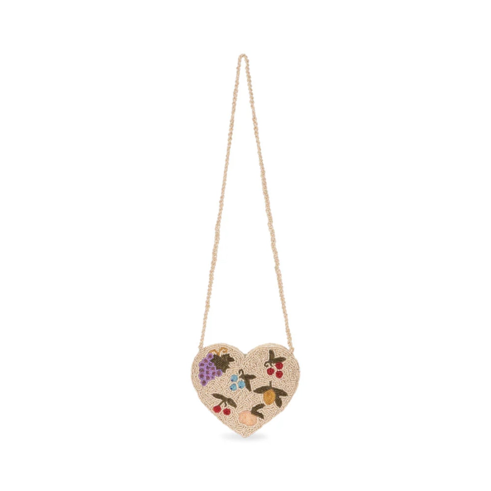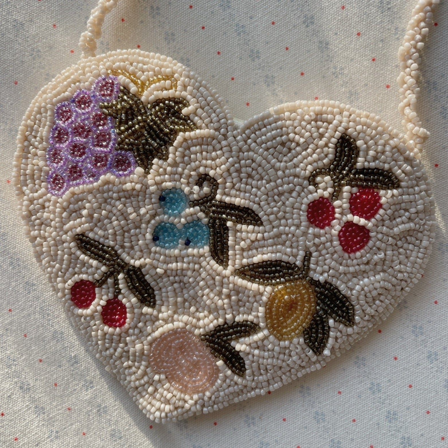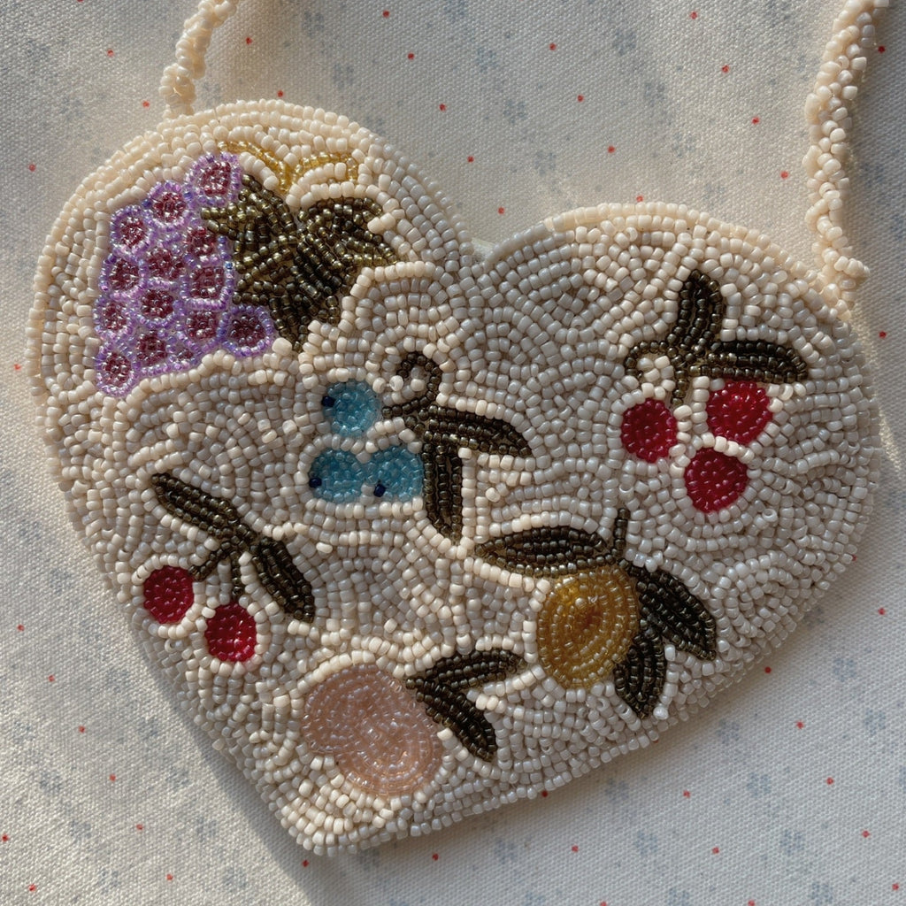 Sweet little heart-shaped shoulder bag adorned with beads that are attached by hand.