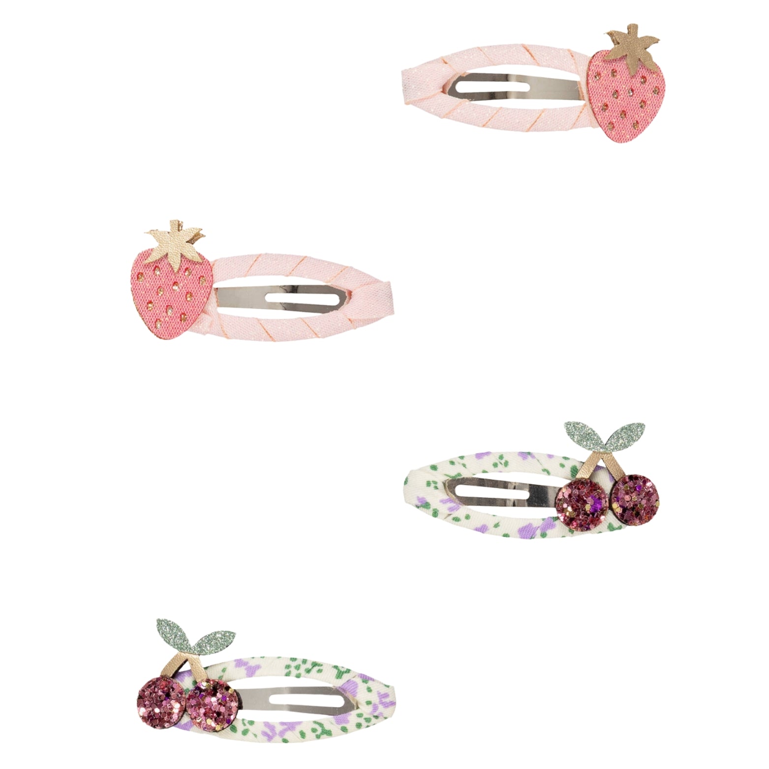 A lovely pack of four pink and purple hair clips for girls by Mimi & Lula. The metal clic clac clips are ribbon and fabric wrapped, featuring two pink strawberry and two purple cherry designs, with glittery detailing for a touch of playful sparkle.
