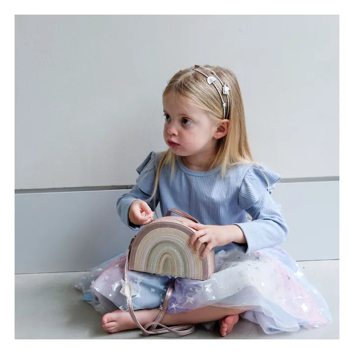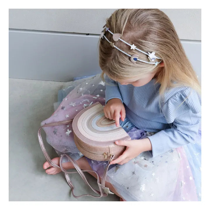 - Add some shimmer and shine with our Pink rainbow bag! Crafted from a beautiful blend of pretty pink hues, glitter and sparkles a plenty, this delightful bag is the ideal accessory to compliment any outfit!