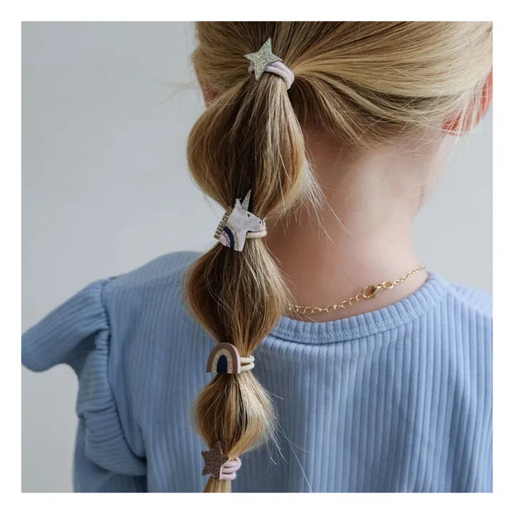 - 3cm stretchy and strong elastics in pale pinks and neutrals adorned with unicorns, rainbows and stars crafted from a pretty mix of soft velvet, glitter and metallic fabrics