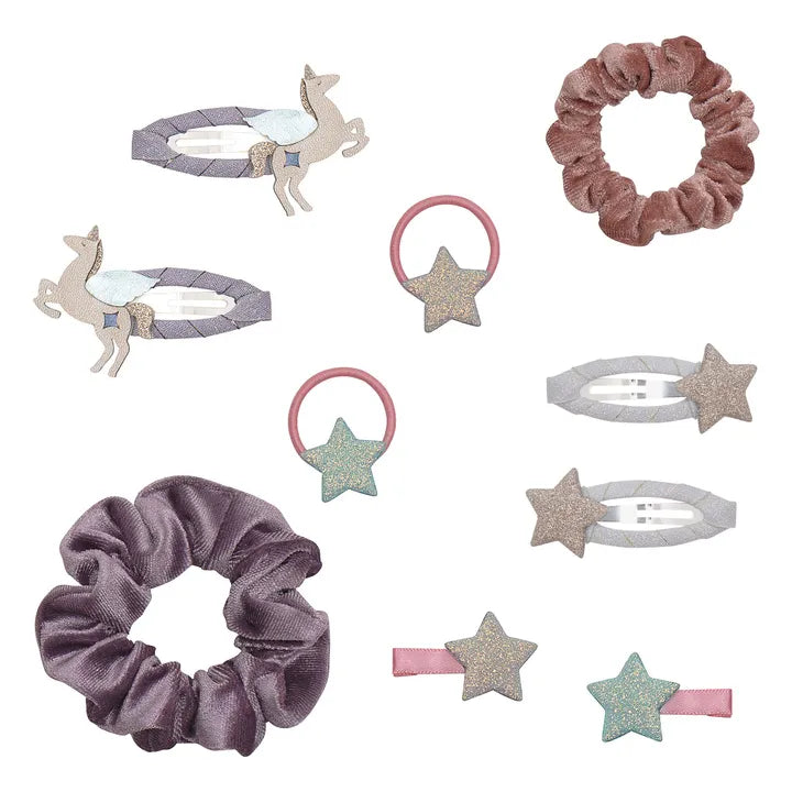 • Our brand new Unicorn sparkle pouch makes the most magical, ready-to-go gift idea! Inside the silver unicorn print, rainbow tulle pouch hides the most beautiful selection of pink and purple unicorn themed ponies and clips!