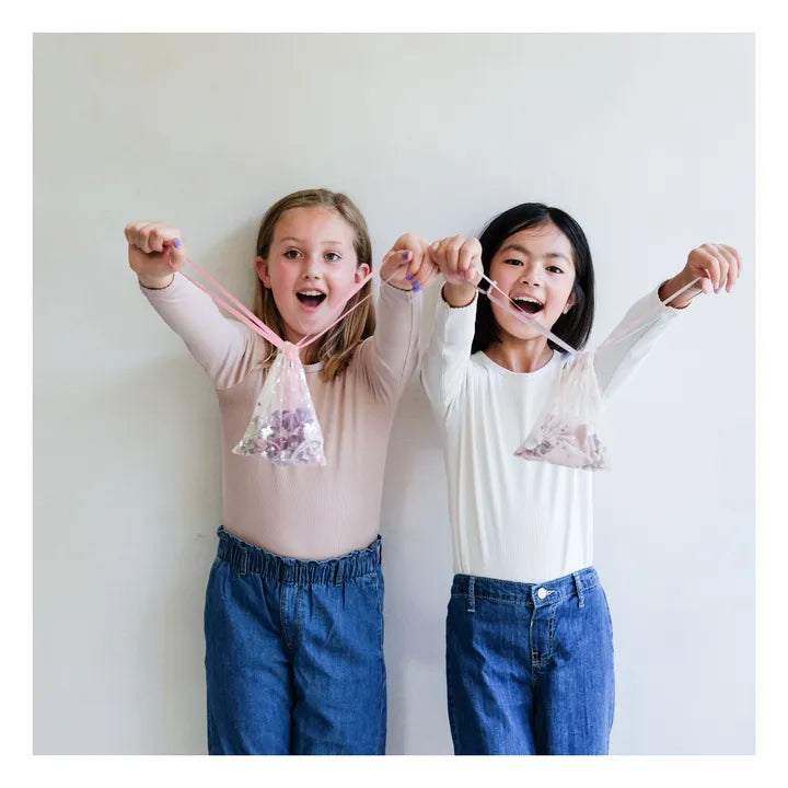 • - Pouch crafted from unicorn and star print, soft tulle fabric with pink satin ribbon tie