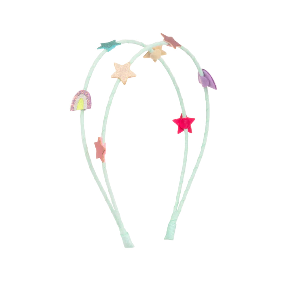 Pretty turquoise blue hairband by Mimi & Lula for girls, with a delightful star theme. This double-band style is wrapped in ribbon and embellished with colourful felt stars and rainbow motifs.
