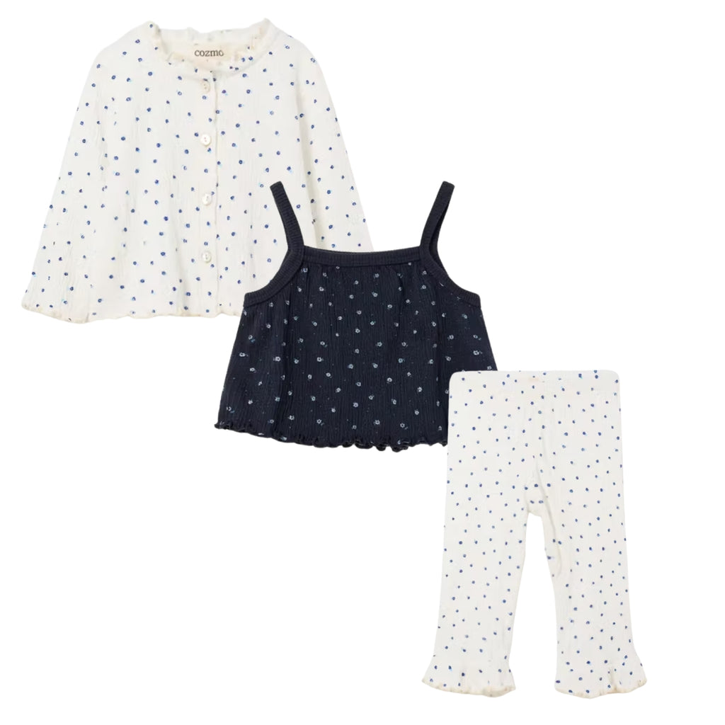 Set of 3 | Floral Baby Bodysuit & Dusty Blue Merino Cardigan & Navy Floral Trousers