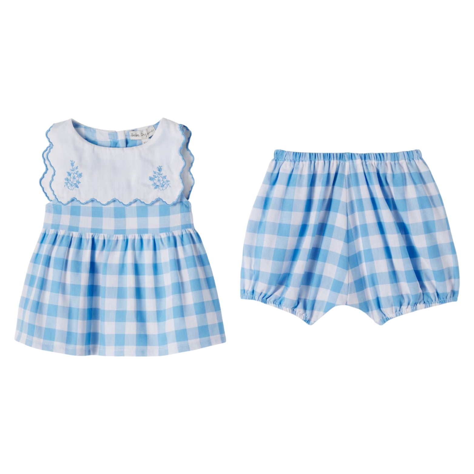 Bebe Organic promises mood-boosting styles for special moments. Crafted from pure, checked cotton, the Viola dress and bloomers set is detailed with floral embroidery at the charming collar.