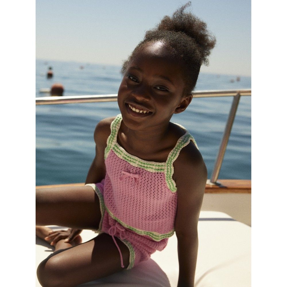 Bebe Organic's mission is to create petite collections focused on sustainability, using natural and organic materials. The Marina set is crocheted from pure cotton and includes a tank top and shorts with scalloped trims.