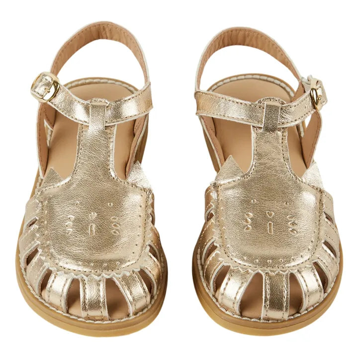 - Sandals in brown suede leather, adorned with perforations on the top of the foot featuring the eyes, whiskers and nose of a kitten - Gold buckle closure - Padded insole for optimum comfort - Smooth leather lining