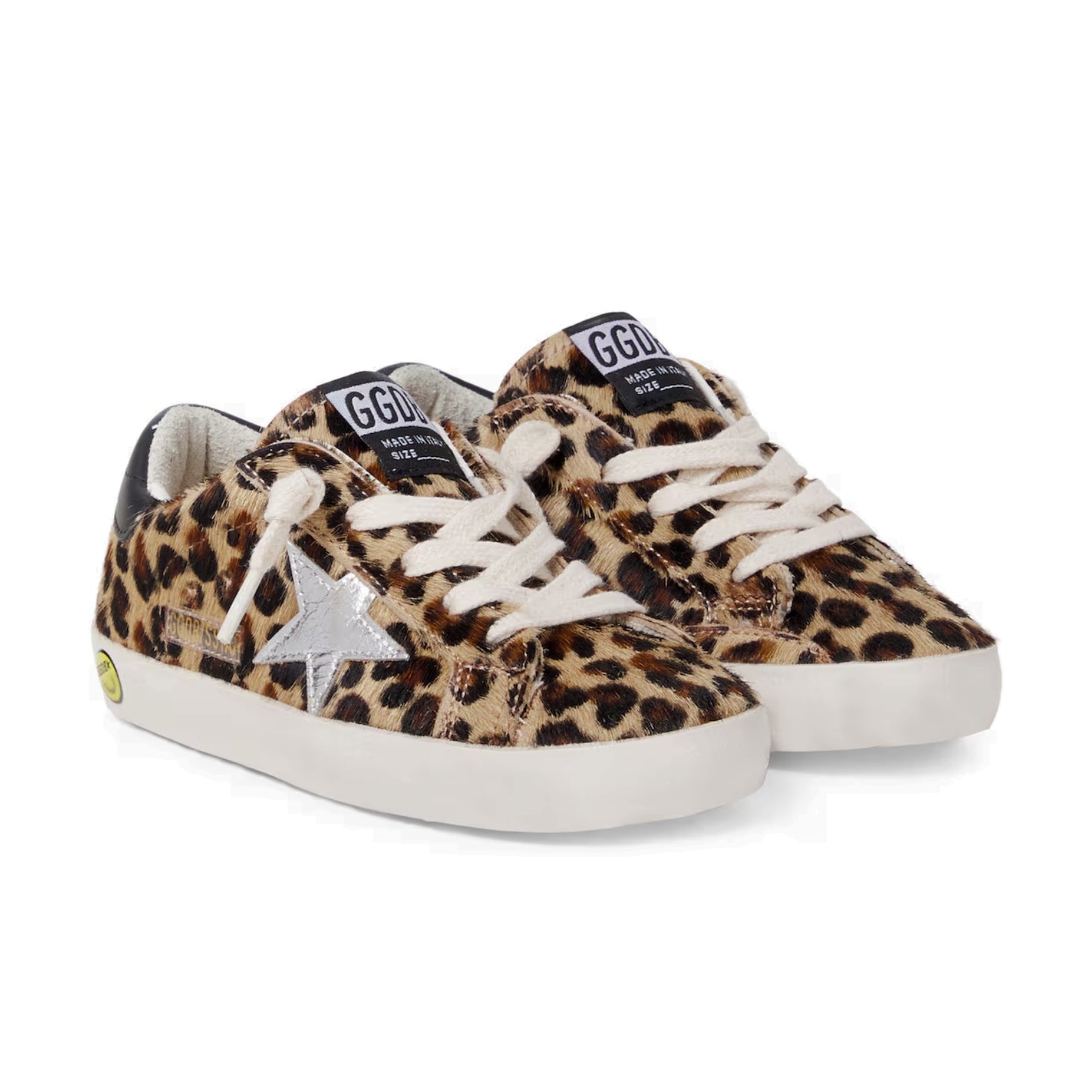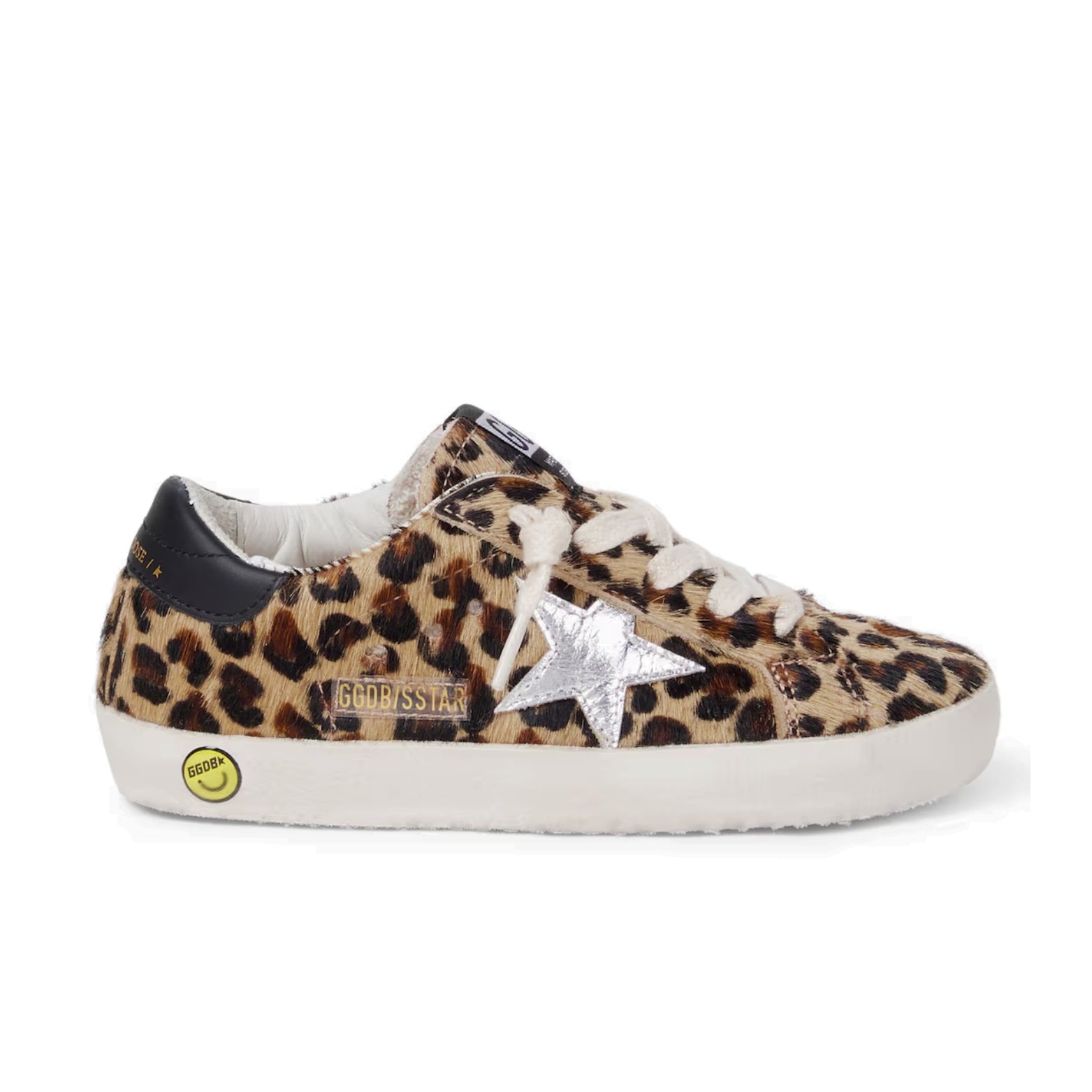 The Super Star sneakers by Golden Goose Kids are made in Italy from calf hair with a bold leopard print. This pair features the brand's signature star appliqués a classic lace-up closure.