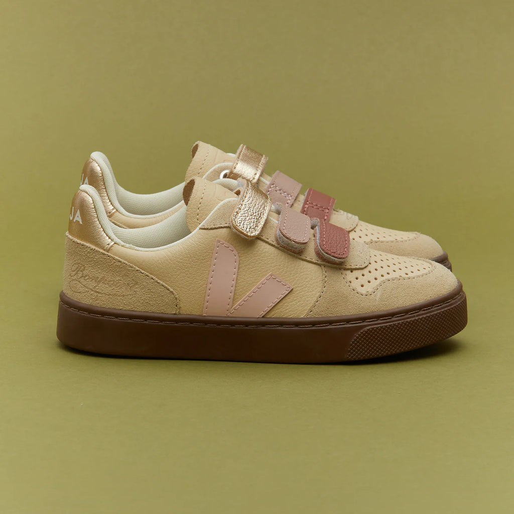 The V10 sneakers from Veja Kids in collaboration with Bonpoint are crafted from smooth suede and leather. This pair features a contrasting V logo and playful pastel VELCRO® straps that add a signature, vibrant touch.