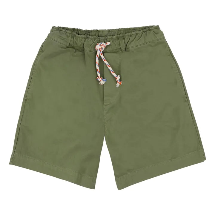 - These shorts with elasticated waistband are made of organic cotton twill - Straight fit Elasticated Waistband Front insert pockets Patch back pocket Strings to create perfect fit 80%cotton and 20%recycled cotton twill