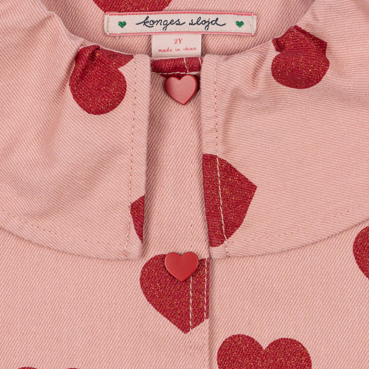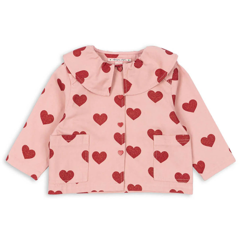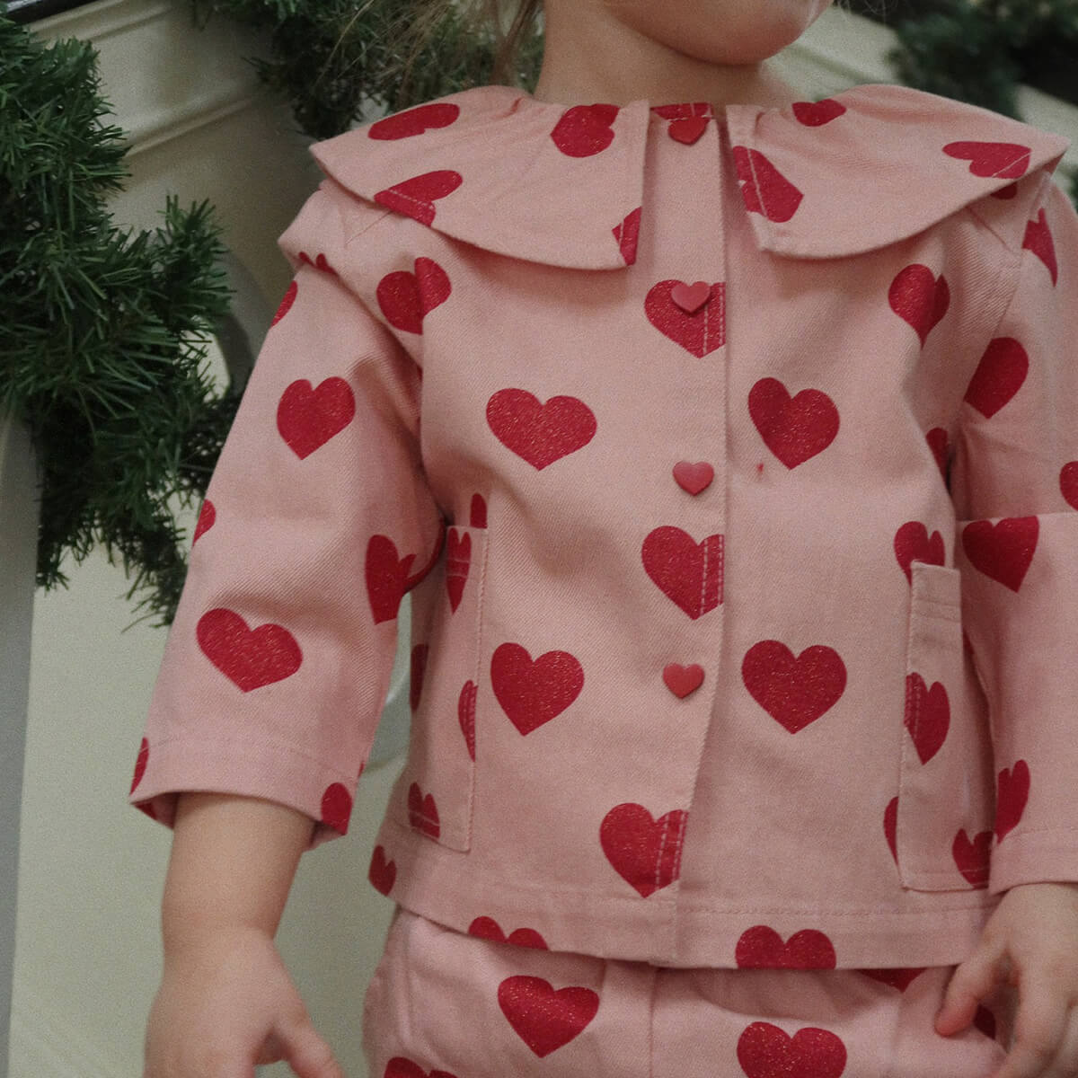 Magot Collar Jacket by Konges Sløjd. Shirt jacket with an all-over heart print and cute heart-shaped push buttons. Designed with a round collar and practical front pockets.