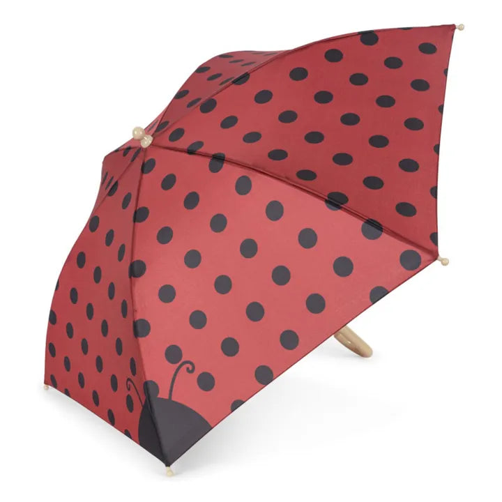 Ladybug umbrella for fun rainy days. Designed with a sturdy frame and a J-shaped handle that makes it easy to control. Practical no-pinch closure. The umbrella has smooth edges, is easy to open and close, and sized just right for little hands. Made with waterproof and durable materials to make sure it lasts throughout the seasons. Suitable from 3y+