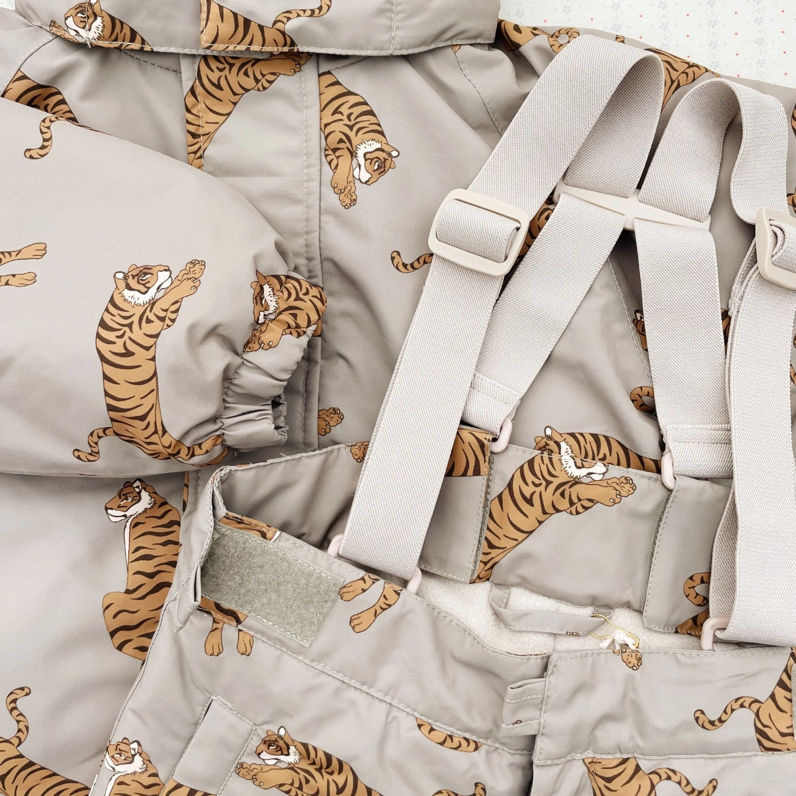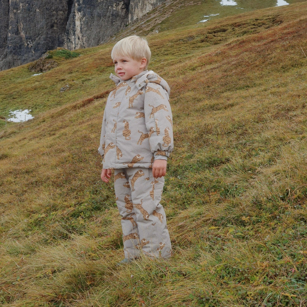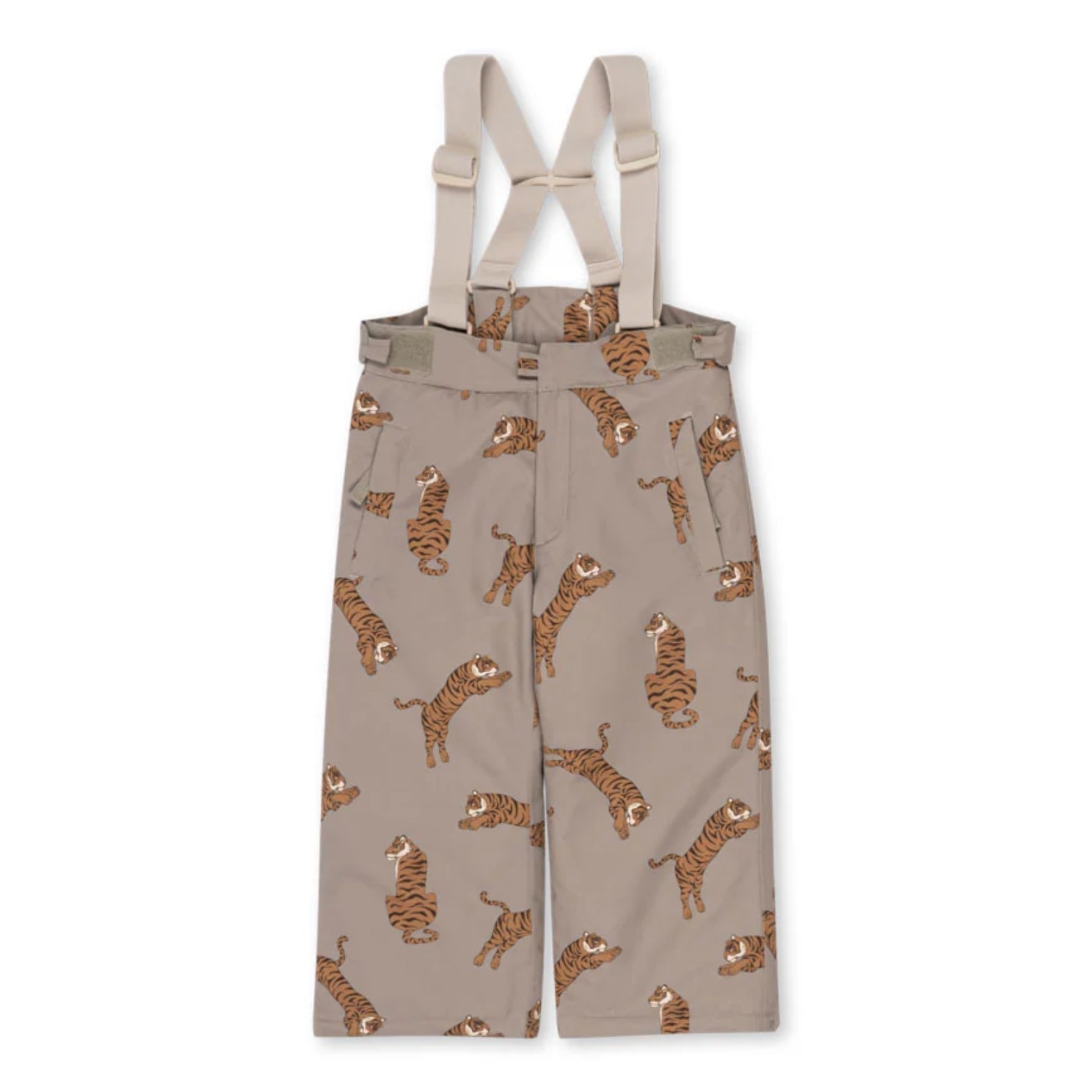 The Mismou snow pants by Konges Sløjd are crafted from an insulating, weatherproof fabric and feature removable suspenders for an adjustable fit. The design is complete with elasticated ankle cuffs for extra protection and finished with playful tiger prints.