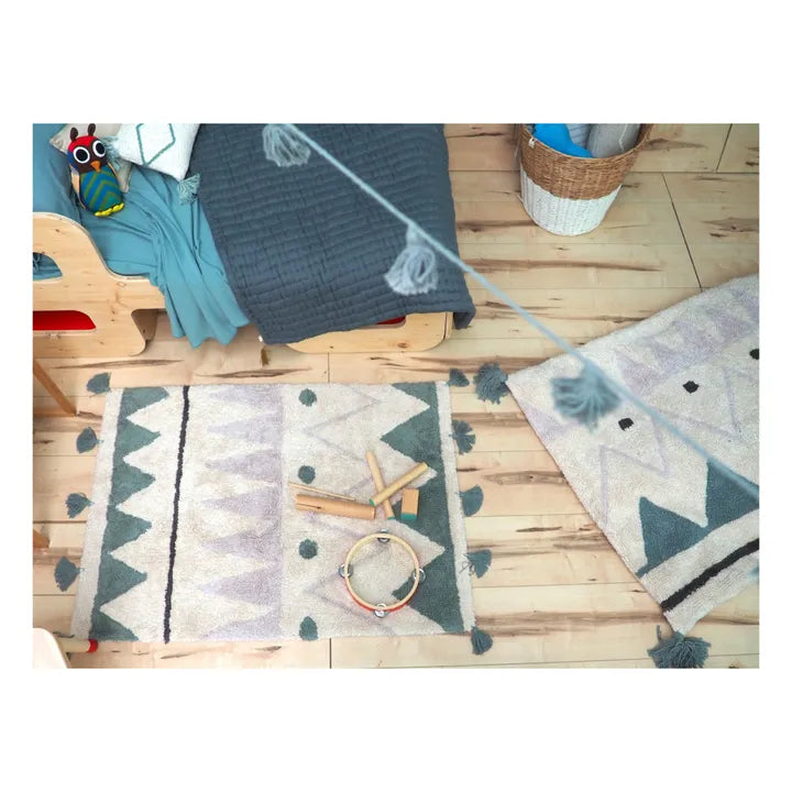 - A practical miniversion of our bestselling Azteca rug. Rectangular washable minirug in natural color, with zigzag lines and dots in Vintage blue and Pearl Grey. Finished with tassels in Vintage blue at the borders.