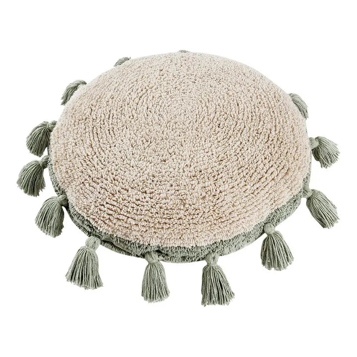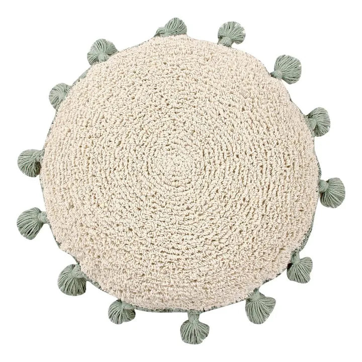 • Who doesn't fancy a touch of chic boho style to finish off their decor? This filled washable round cushion with base in Natural colour using loop technique and medium green tassels all around, fits the purpose any time and on any surface, be it the sofa, the floor, the playroom, the garden, or a reading nook. When the chill-out mood strikes, be sure to have one near you!