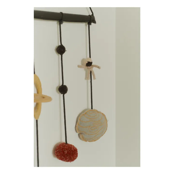 - Introduce a cosmic adventure into any room with the Cosmos wall hanger. This handcrafted wall decoration features a charming rope astronaut, playful orbits made from cotton cords, textile planets with long bangs and colorful details throughout. This upgraded version of Lorena Canals' classic wall decoration features enhanced cool colors in dark gray, sage blue, brown, red and honey, as well as an improved design.