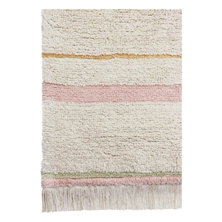 - Washable rug inspired by a pattern of wide and narrow lanes. The rug plays with different pile heights, where the longer soft plush in natural color combines with contrasted colored lines of Vintage Nude, Honey and Dark Olive in extra short piles. Finished with natural color fringes at the borders