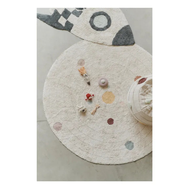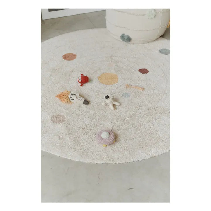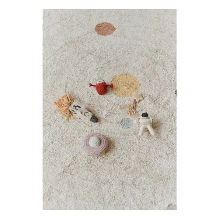 - Explore the solar system with this beautiful washable play mat! Handcrafted with a natural cotton base and adorned with fine gray stripes simulating orbits and planets, this round interactive mat is both decorative and practical. The mat includes a small cotton bag with 5 handcrafted accessories: a mini alien, a mini UFO, a mini shooting star, a mini astronaut and a mini rocket. This versatile mat not only adds charm to any room, but also stimulates creativity and enhances learning for little explorers. Discover the wonders of space with the Solar System washable playmat.