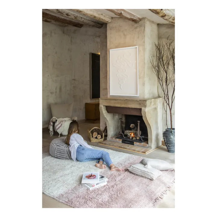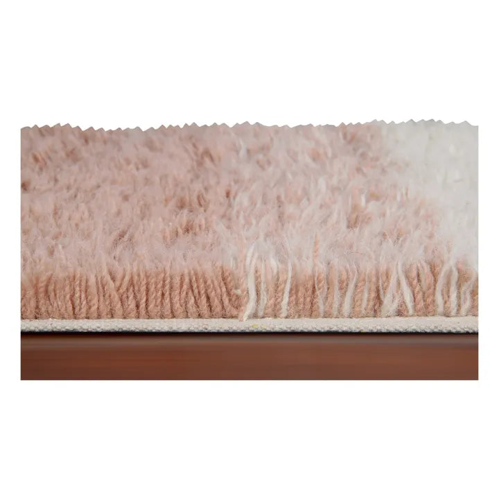 - Bring a hint of the warm summer light into your home, made up of sunsets and breezy evenings, that inspire the colorway of this soft and shaggy washable wool rug. Spruce up your decor and enjoy the year-round benefits of wool—cool in summer and warm in winter. Medium pile rectangular wool rug in soft colors shades of Dusty Pink, Natural and Champagne. Finished with handmade cross-knotted wool fringes at edges. It comes packed in a cotton tote bag.